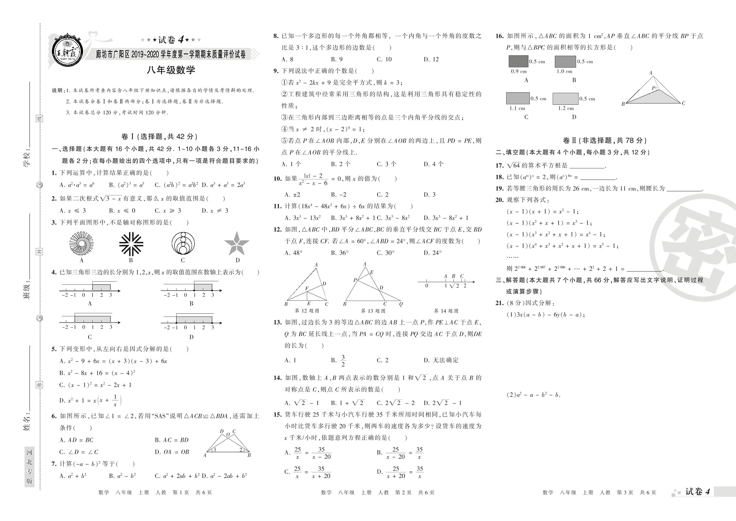 2019-2020学年第一学期廊坊市广阳区八年级数学试卷(人教版)【4】