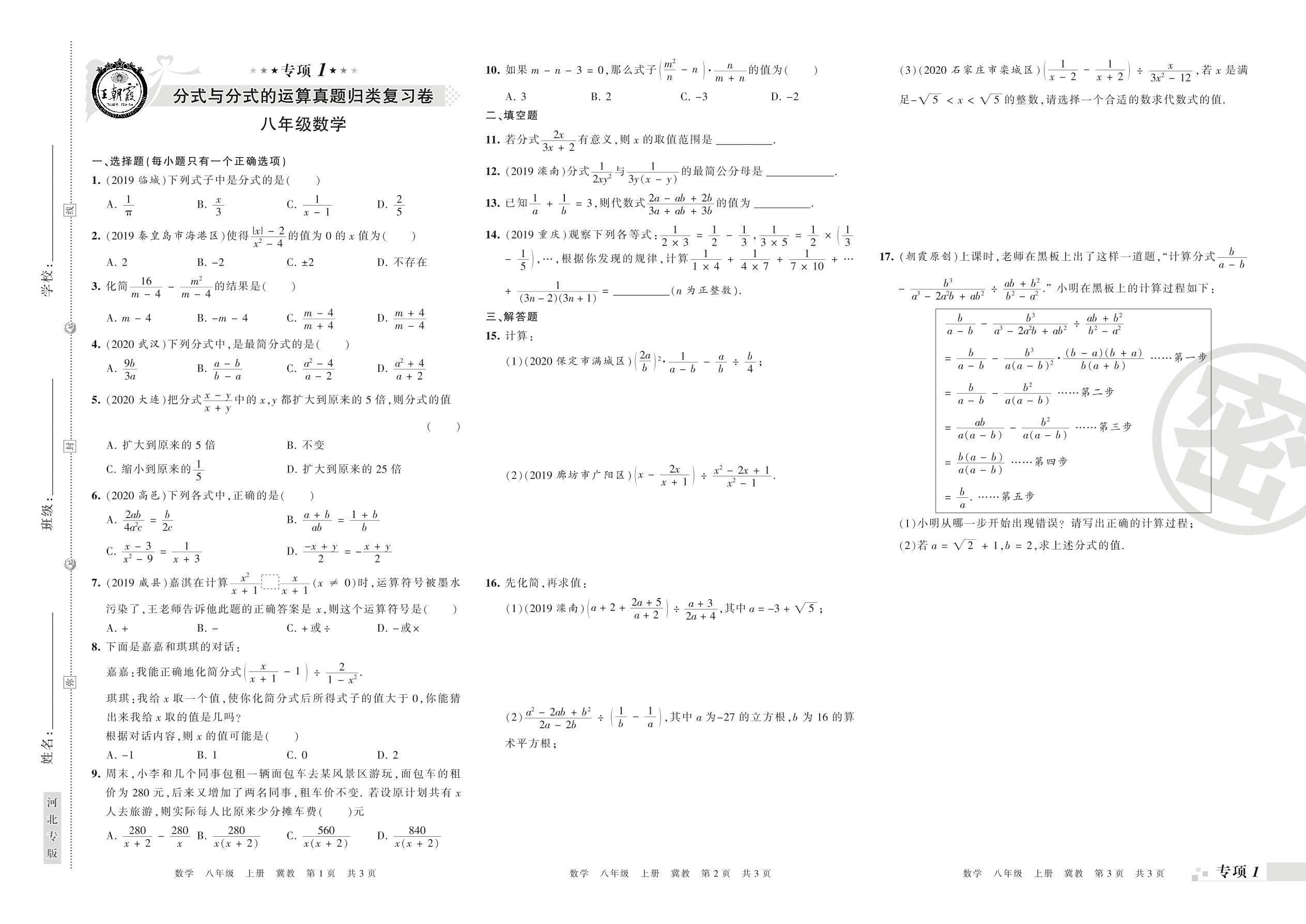 王朝霞期末专项卷——分式与分式的运算、分式方程及其应用真题归类复习八年级上册数学(冀教版)【0】
