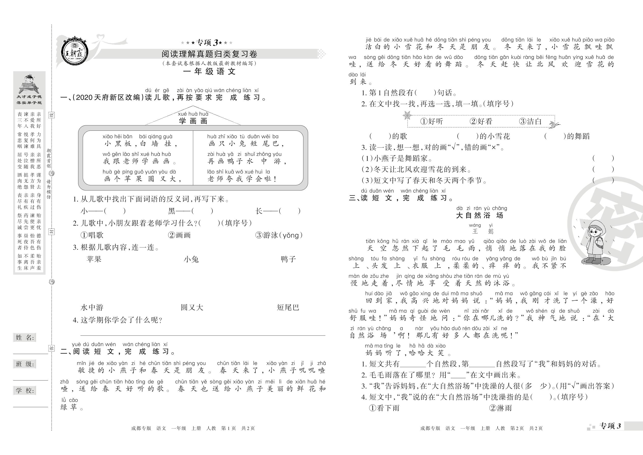 王朝霞期末专项卷——阅读理解、写话真题归类复习一年级上册语文(人教版)_R210731174537【0】