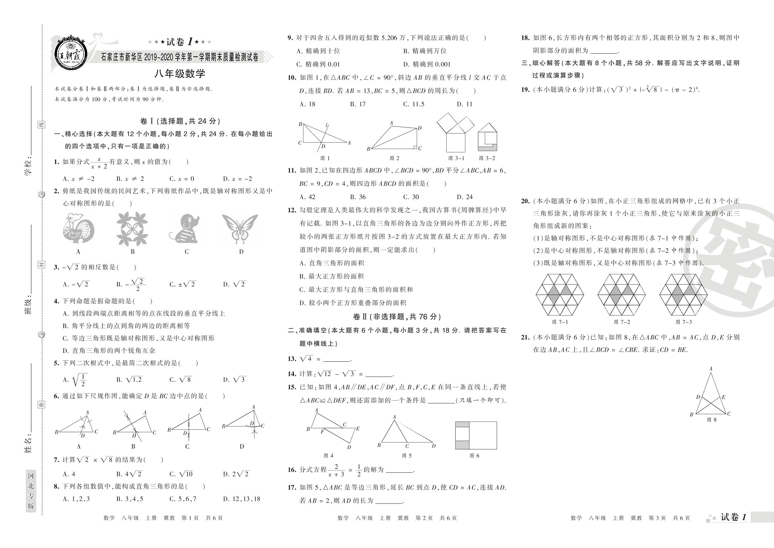 2019-2020学年第一学期石家庄市新华区八年级数学试卷(冀教版)【1】