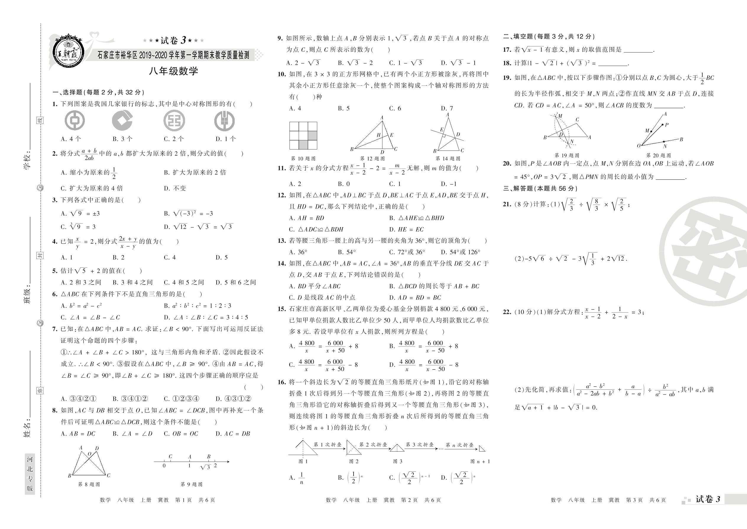 2019-2020学年第一学期石家庄市裕华区八年级数学试卷(冀教版)【3】