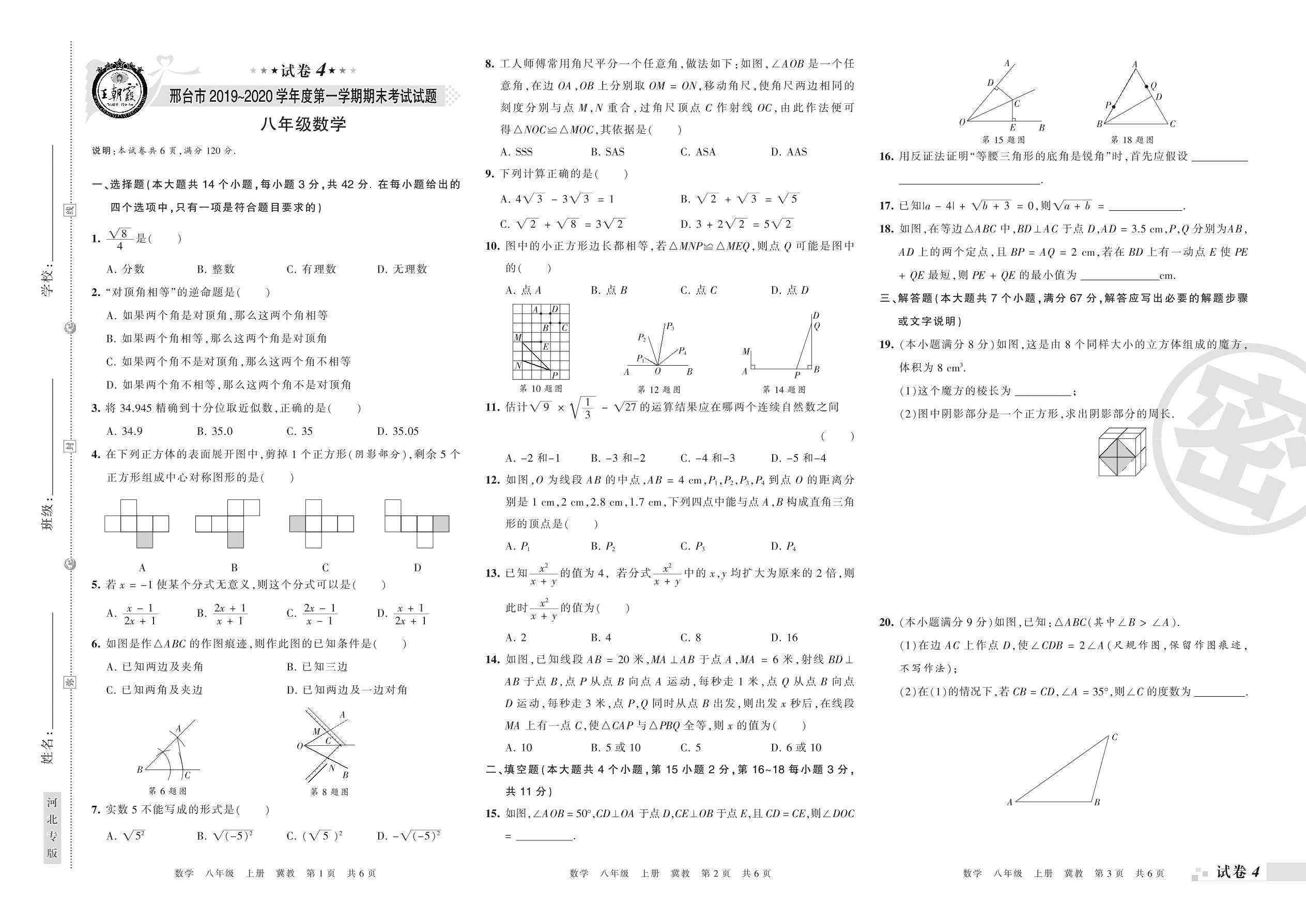 2019-2020学年第一学期邢台市八年级数学试卷(冀教版)【4】