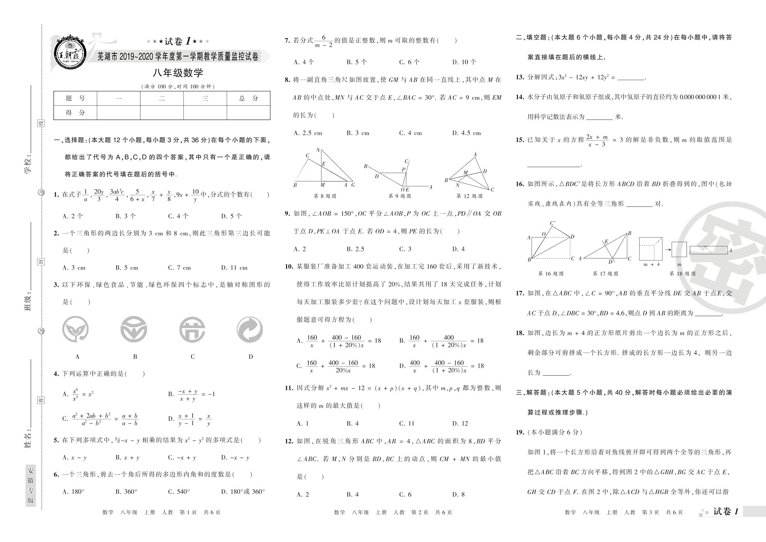 2019-2020学年第一学期芜湖市八年级数学试卷(人教版)【1】