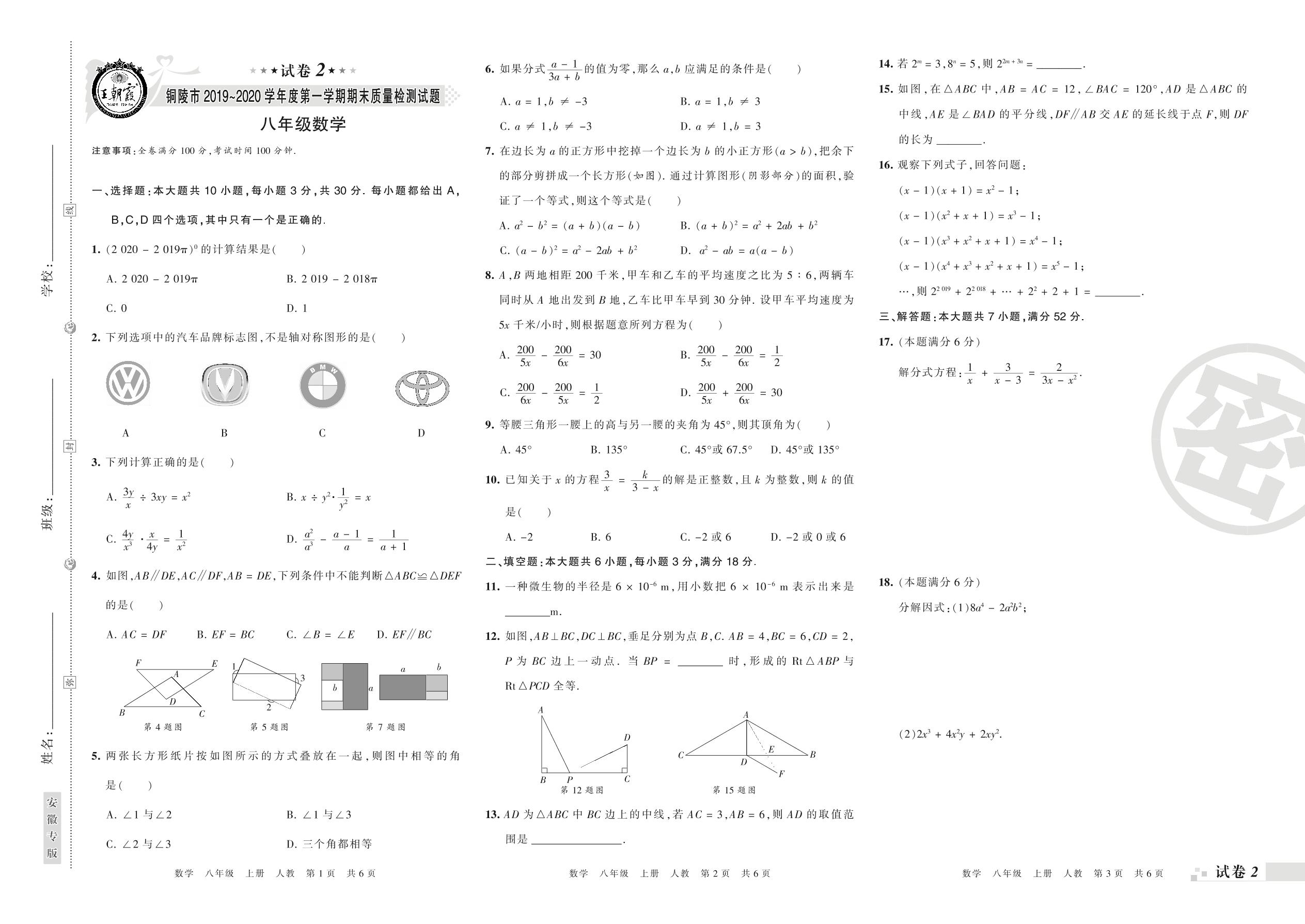 2019-2020学年第一学期铜陵市八年级数学试卷(人教版)【2】