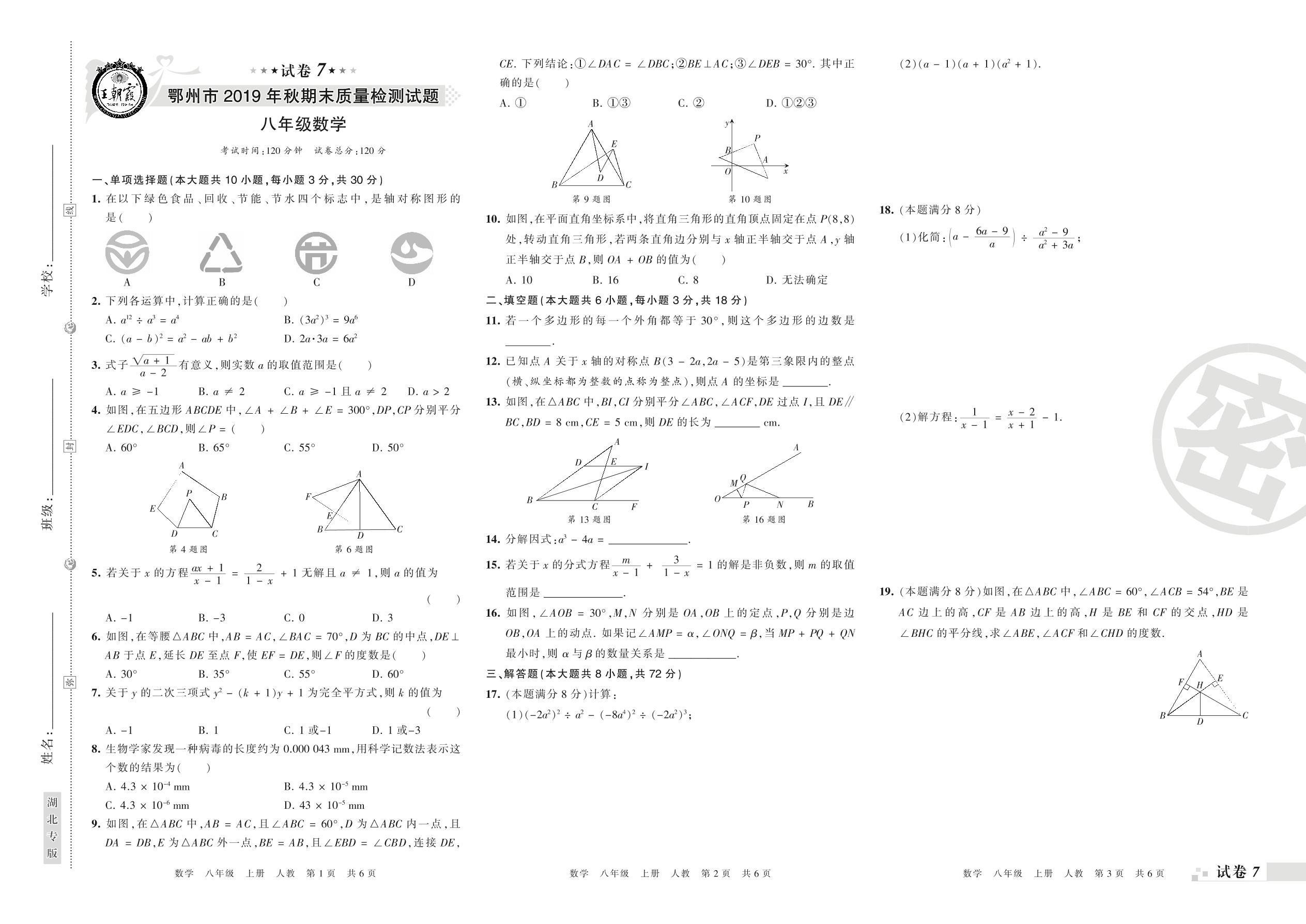 2019-2020学年第一学期鄂州市八年级数学试卷(人教版)【7】