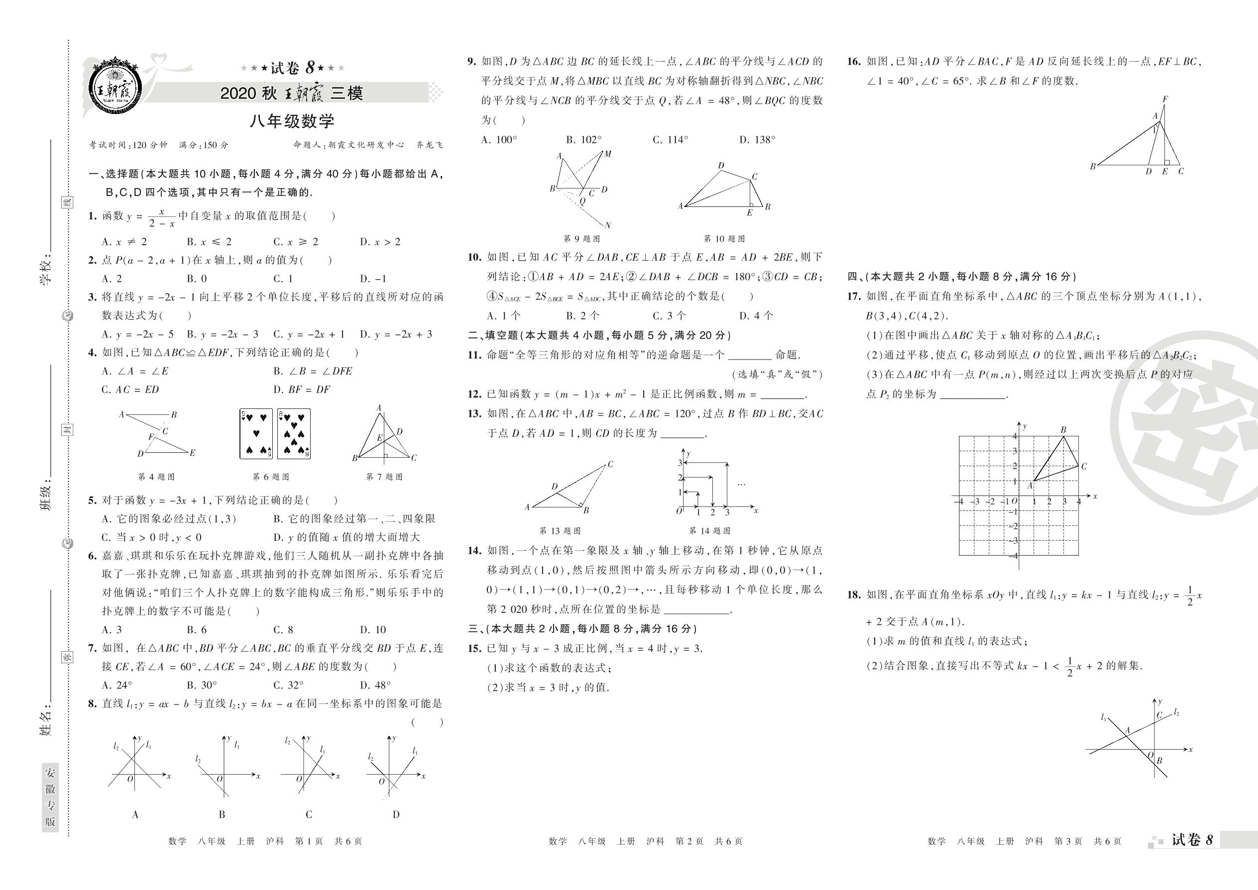 王朝霞期末模拟卷八年级上册数学(沪科版)【8】