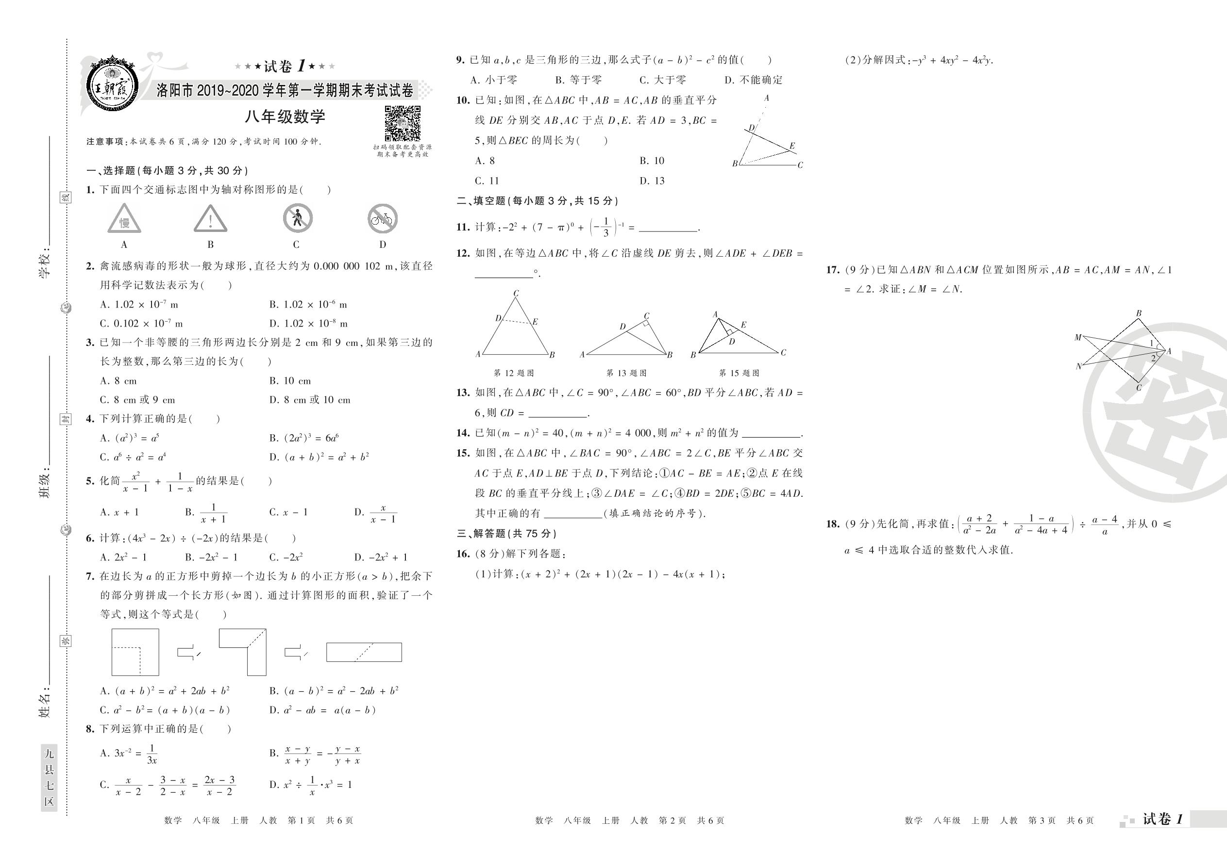 2019-2020学年第一学期洛阳市八年级数学试卷(人教版)_R21080694005【1】
