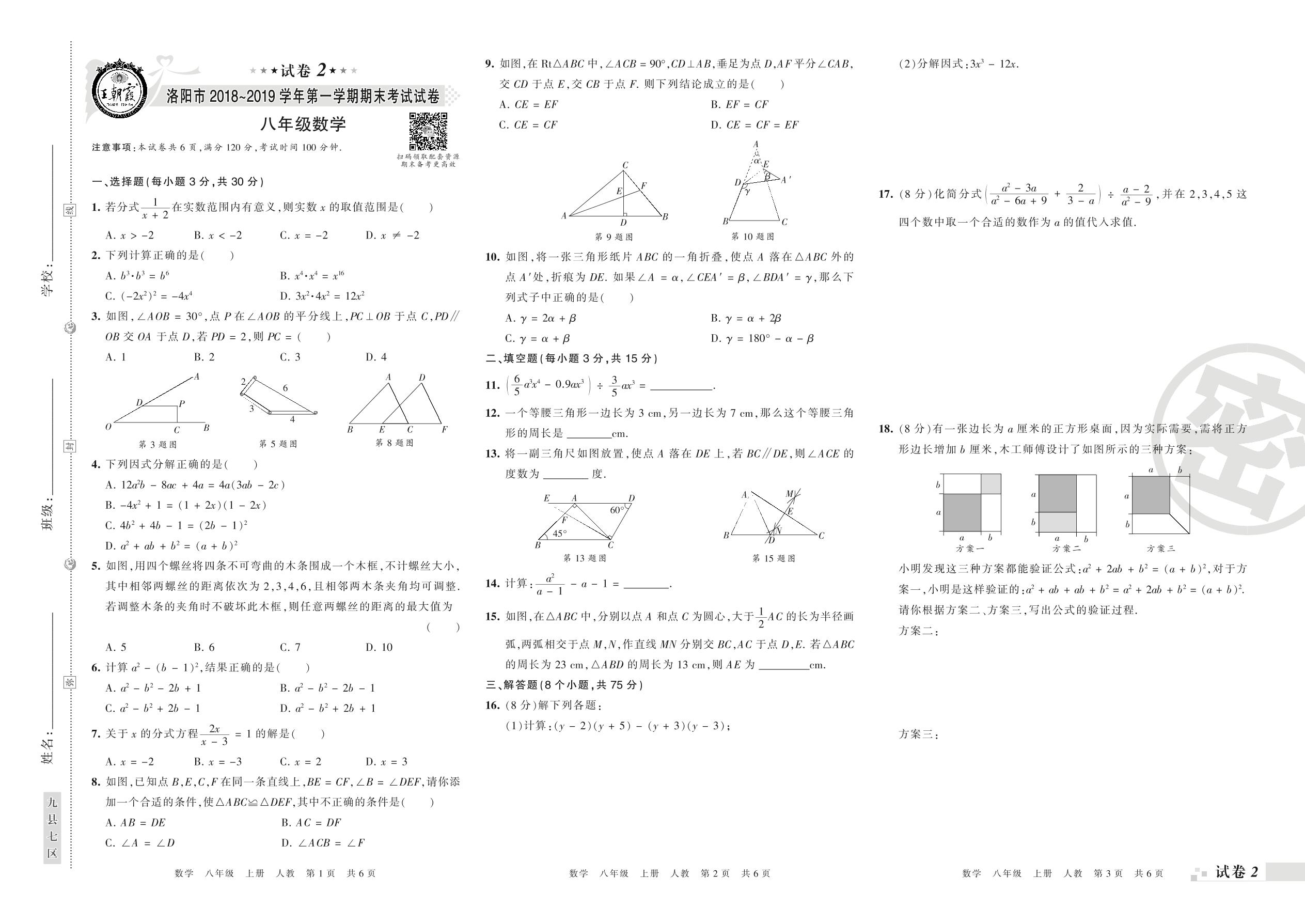 2018-2019学年第一学期洛阳市八年级数学试卷(人教版)【2】