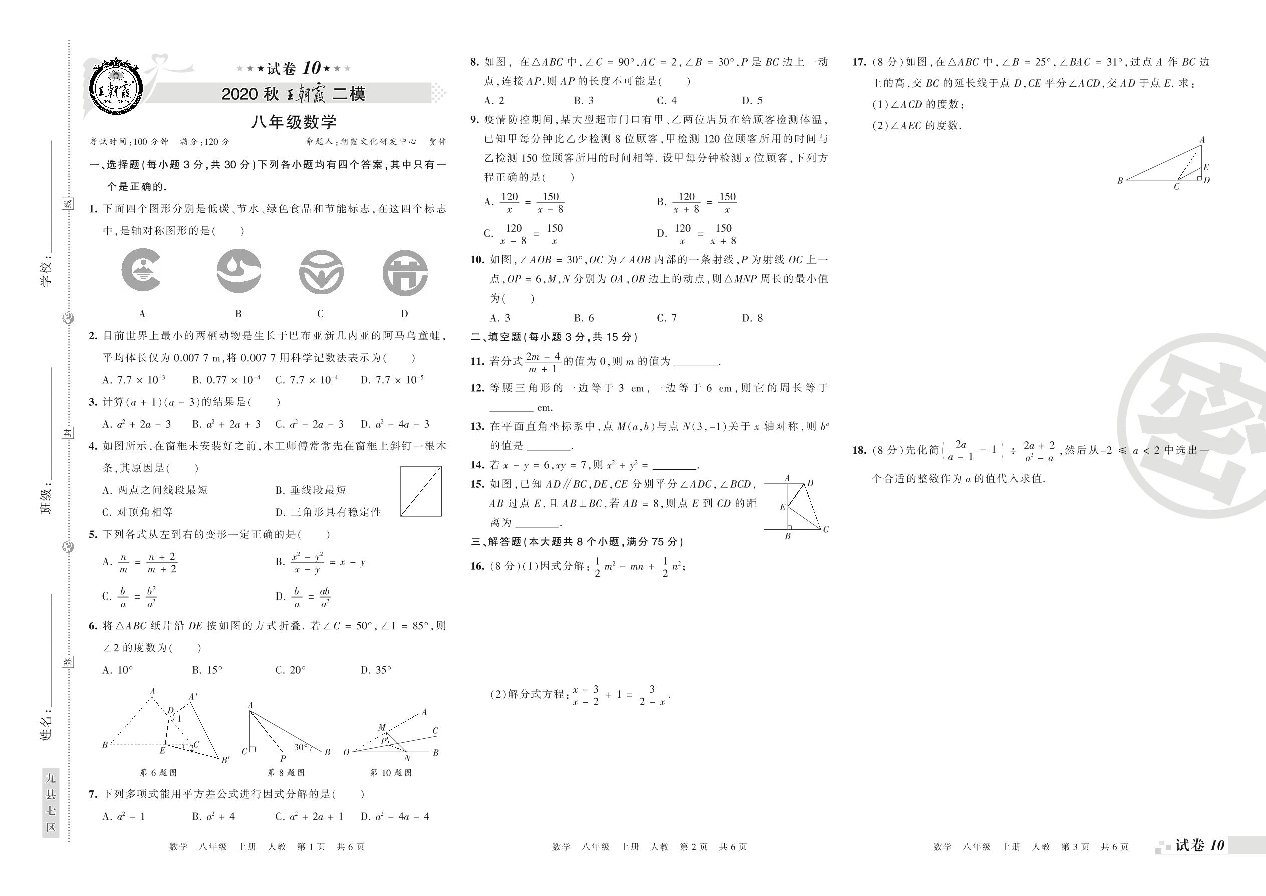 王朝霞期末模拟卷八年级上册数学(人教版)【10】