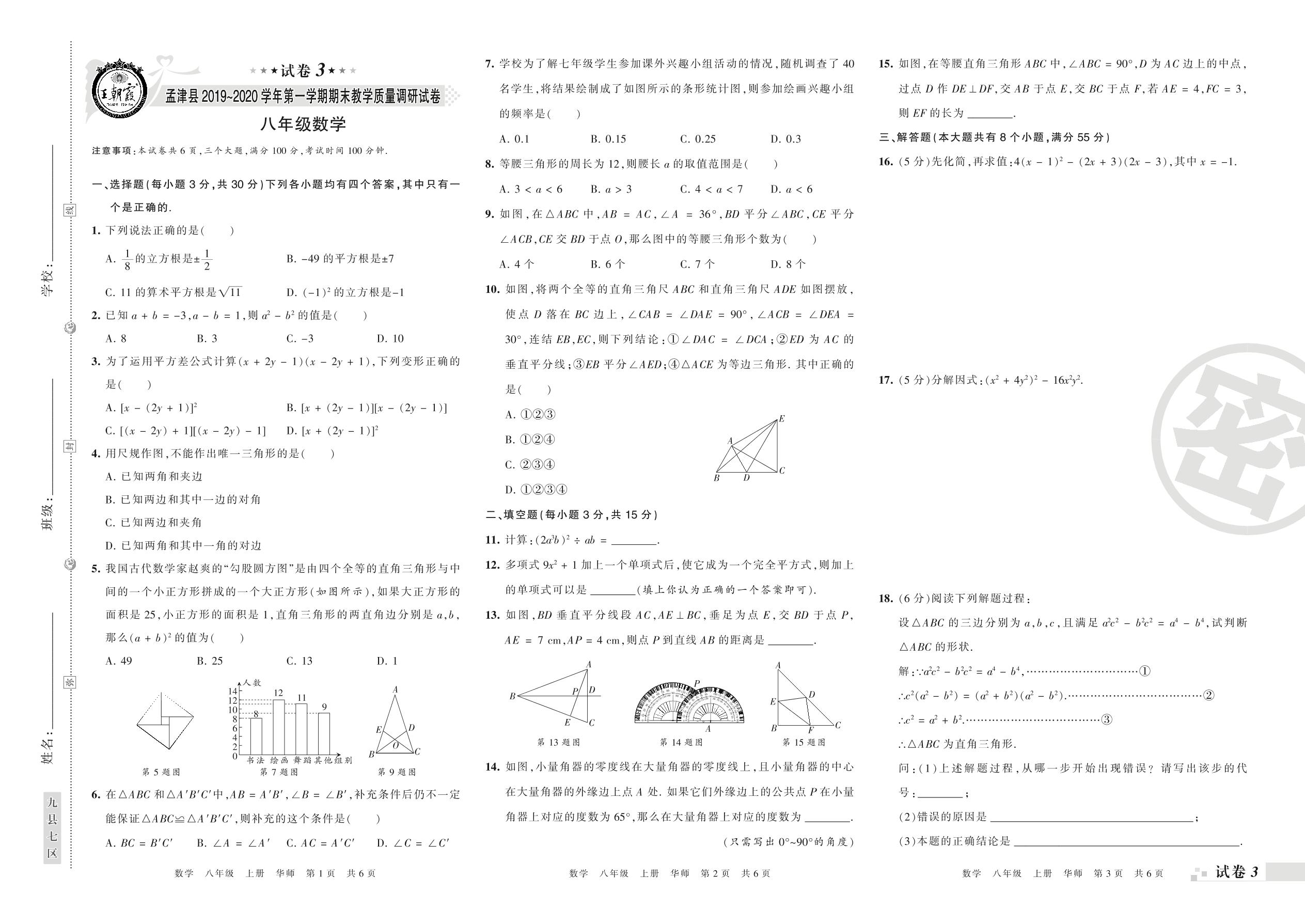 2019-2020学年第一学期洛阳市孟津县八年级数学试卷(华师版)【3】