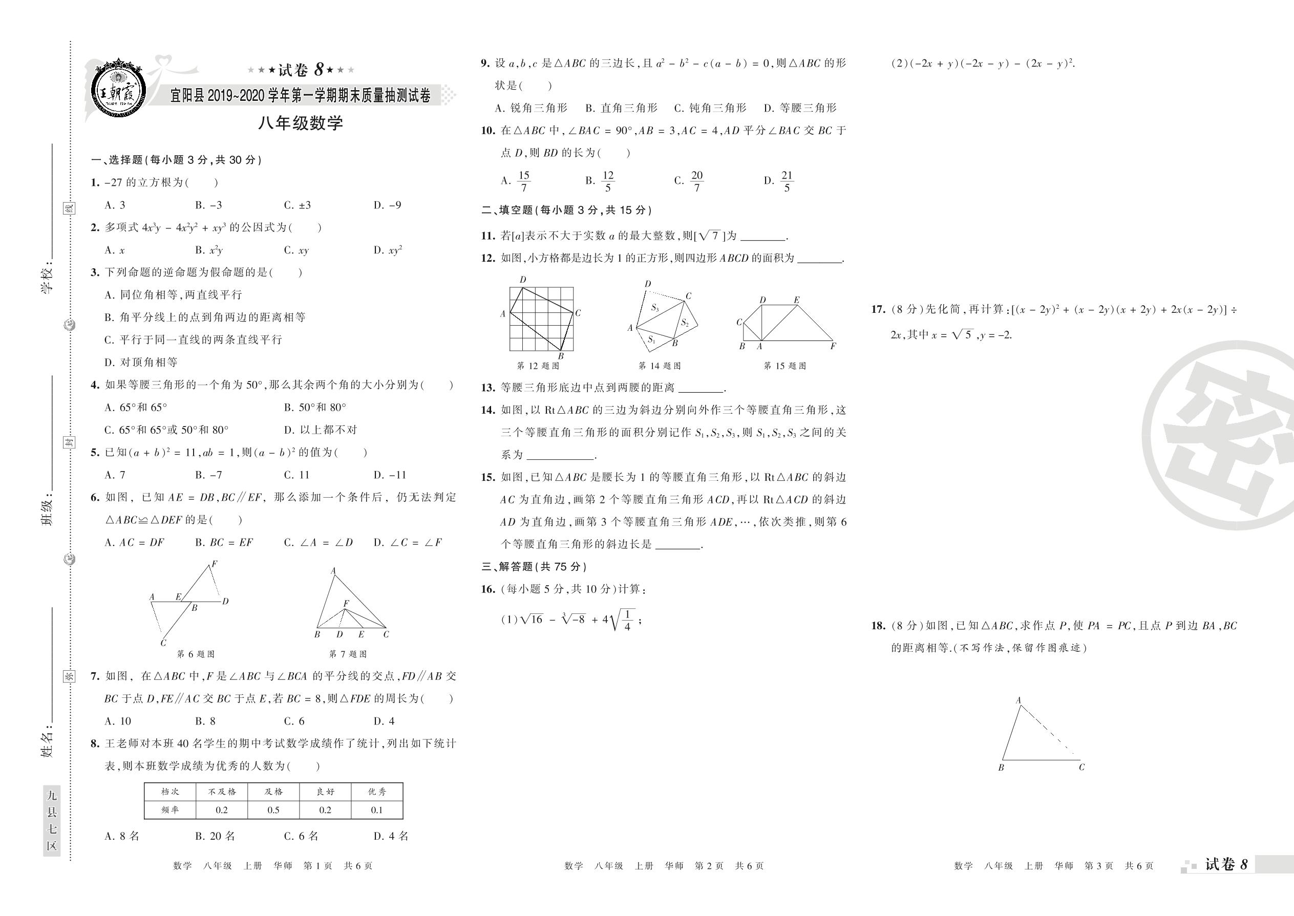 2019-2020学年第一学期洛阳市宜阳县八年级数学试卷(华师版)【8】