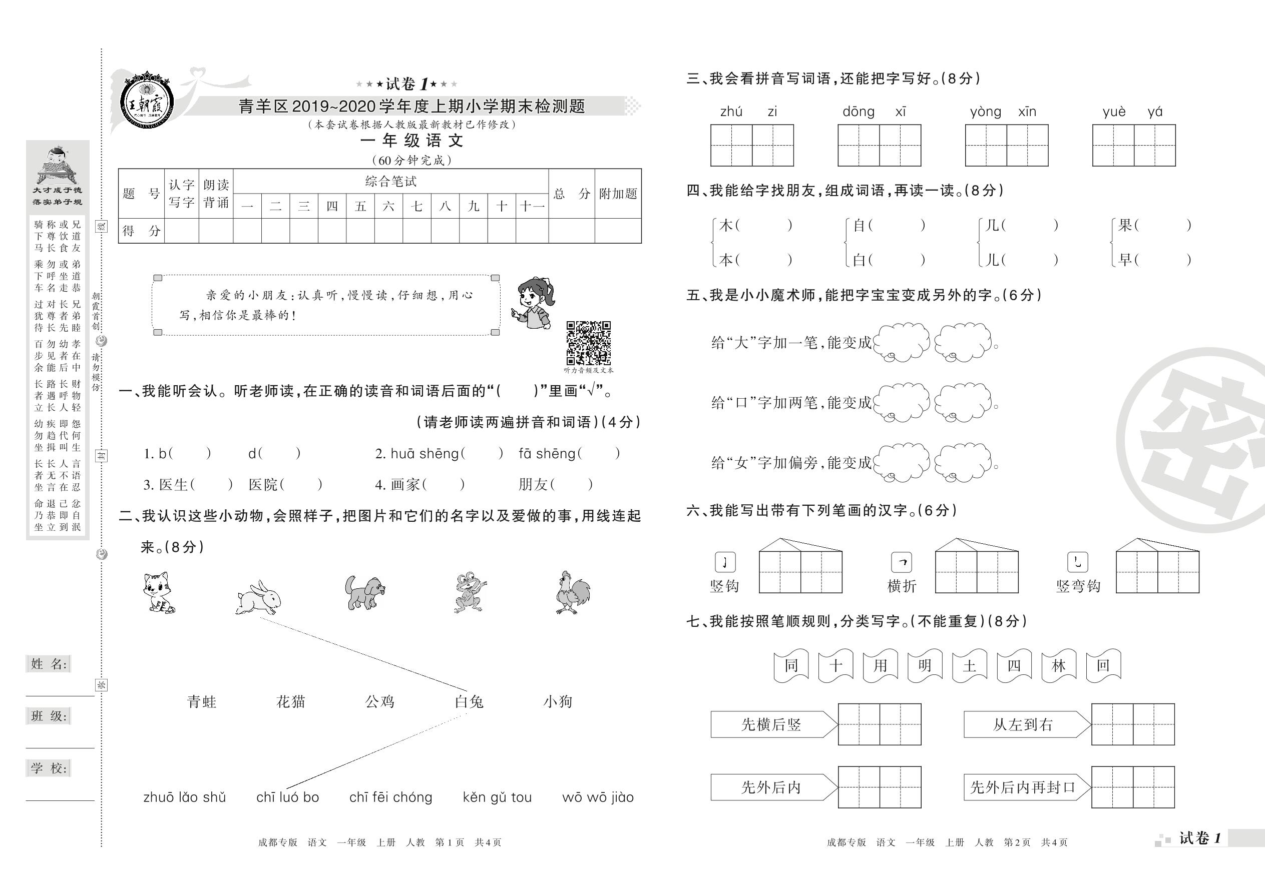 2019-2020学年第一学期成都市青羊区一年级语文试卷(人教版)【1】
