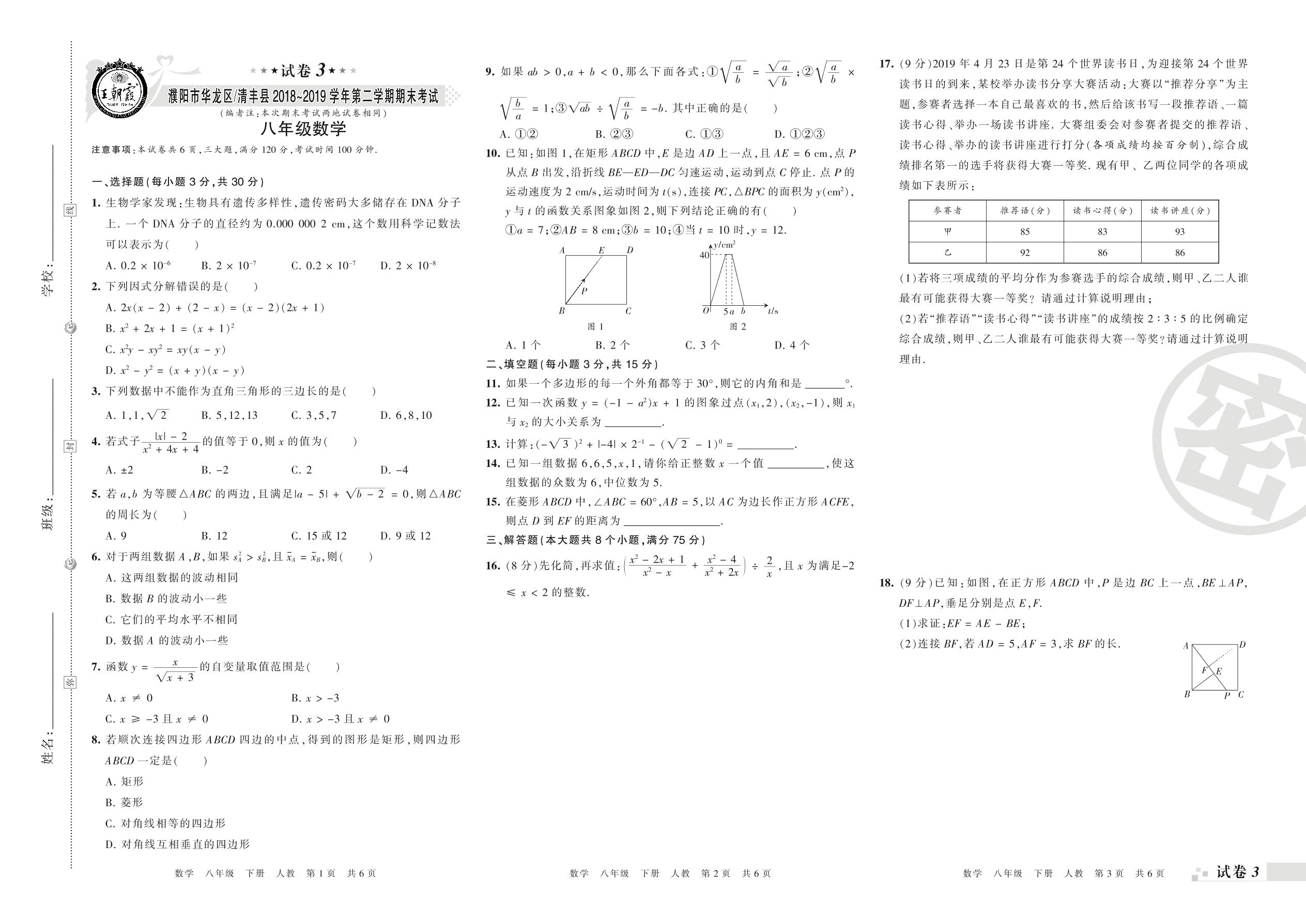 2018-2019学年第二学期濮阳市华龙区(清丰县)八年级数学试卷(人教版)【3】