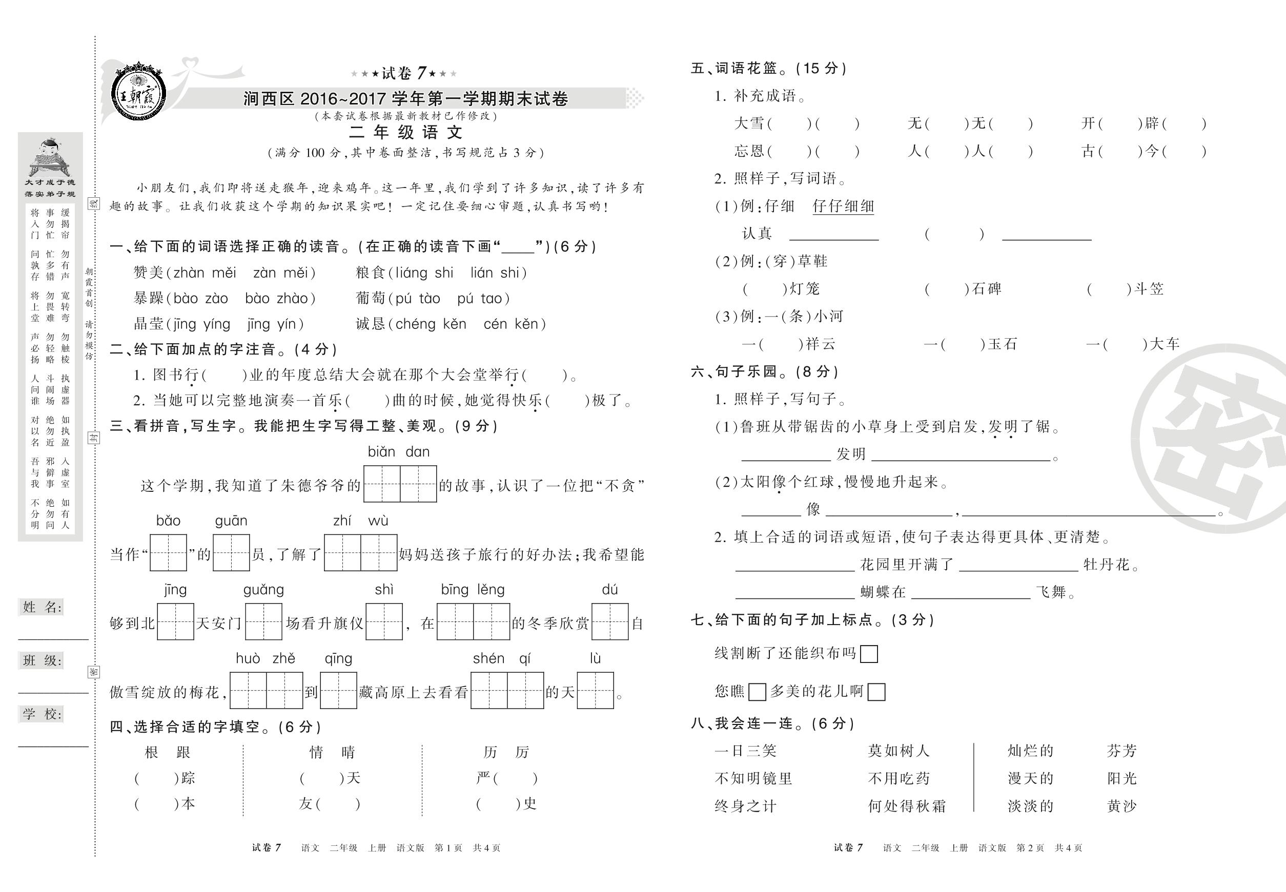 2016-2017学年第一学期洛阳市涧西区二年级语文试卷(语文版)【7】