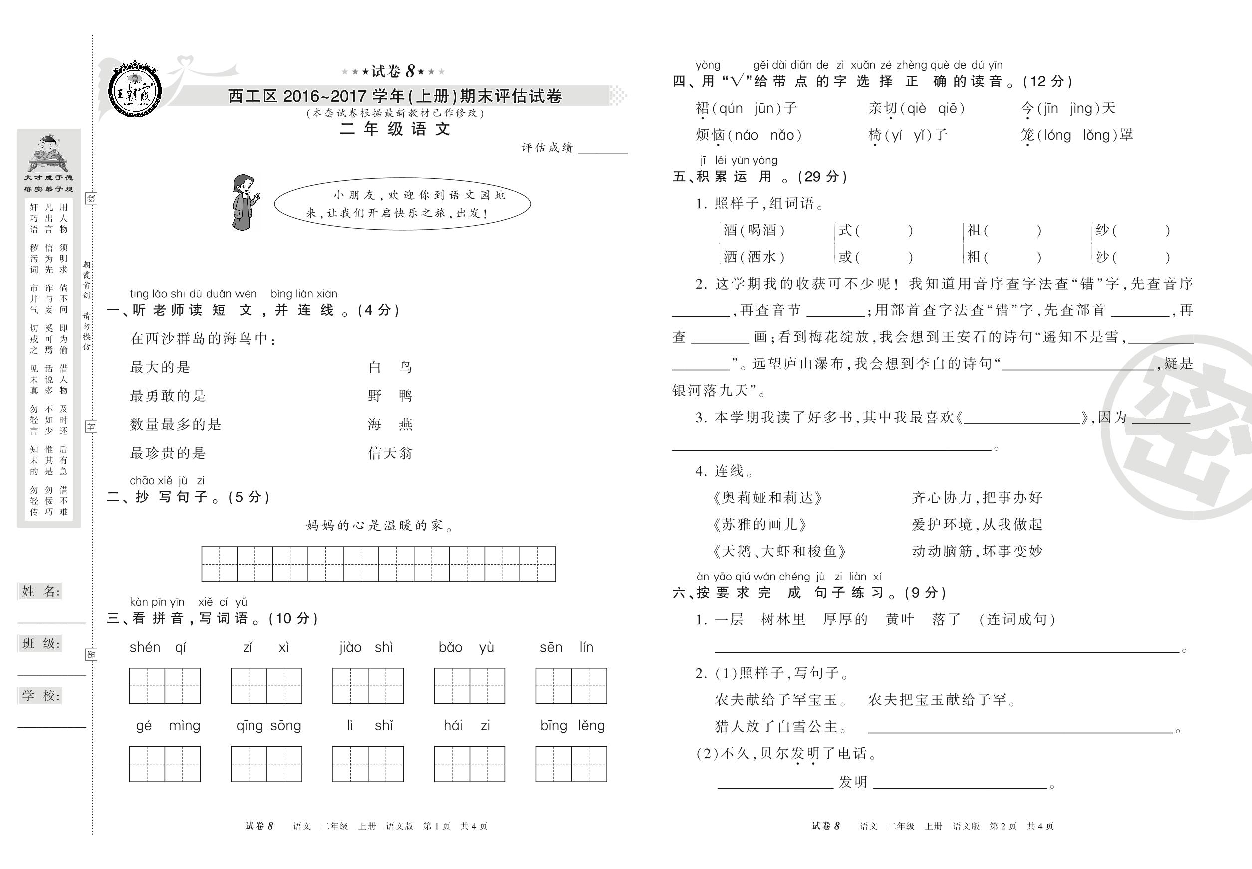 2016-2017学年第一学期洛阳市西工区二年级语文试卷(语文版)【8】