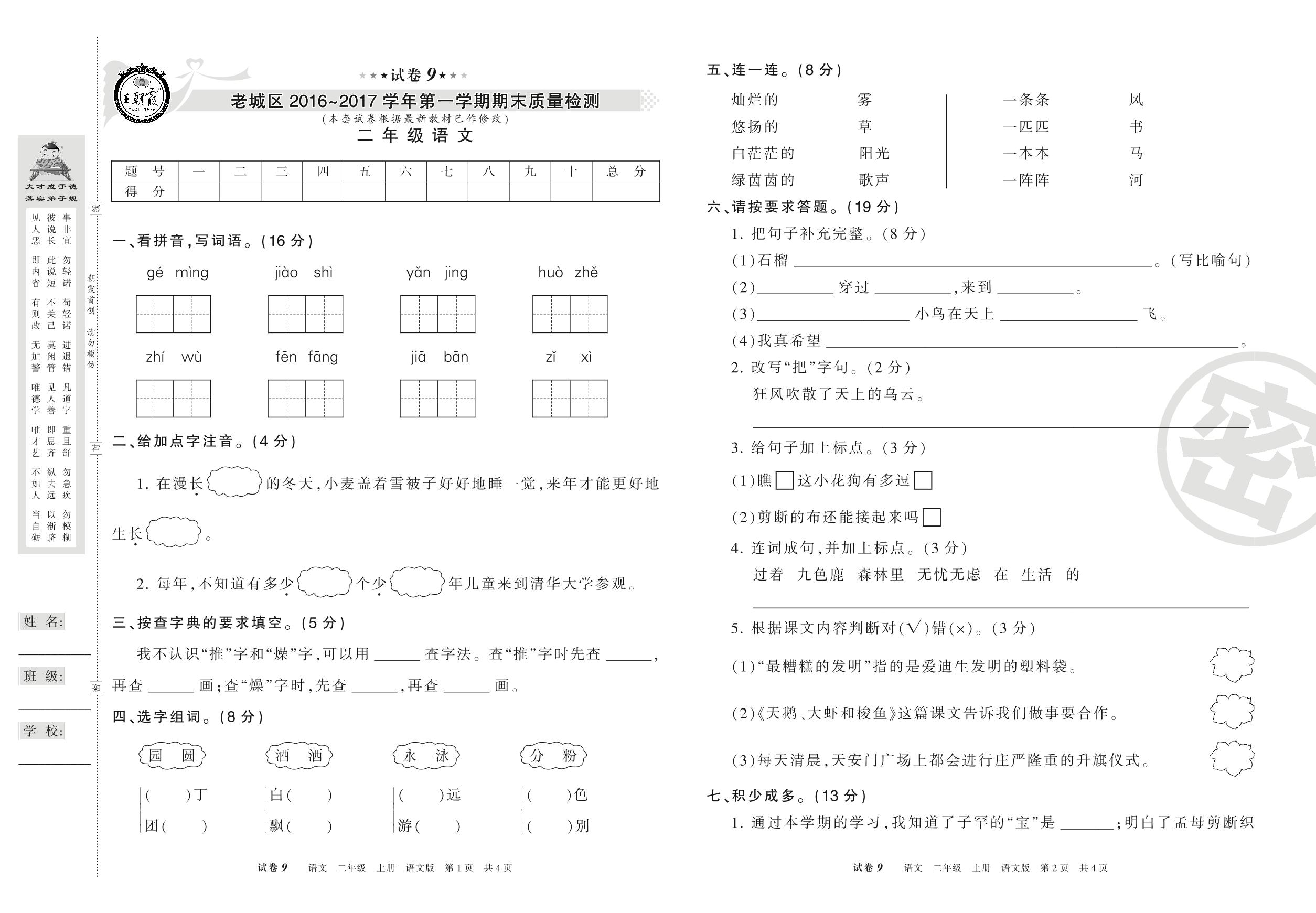2016-2017学年第一学期洛阳市老城区二年级语文试卷(语文版)【9】