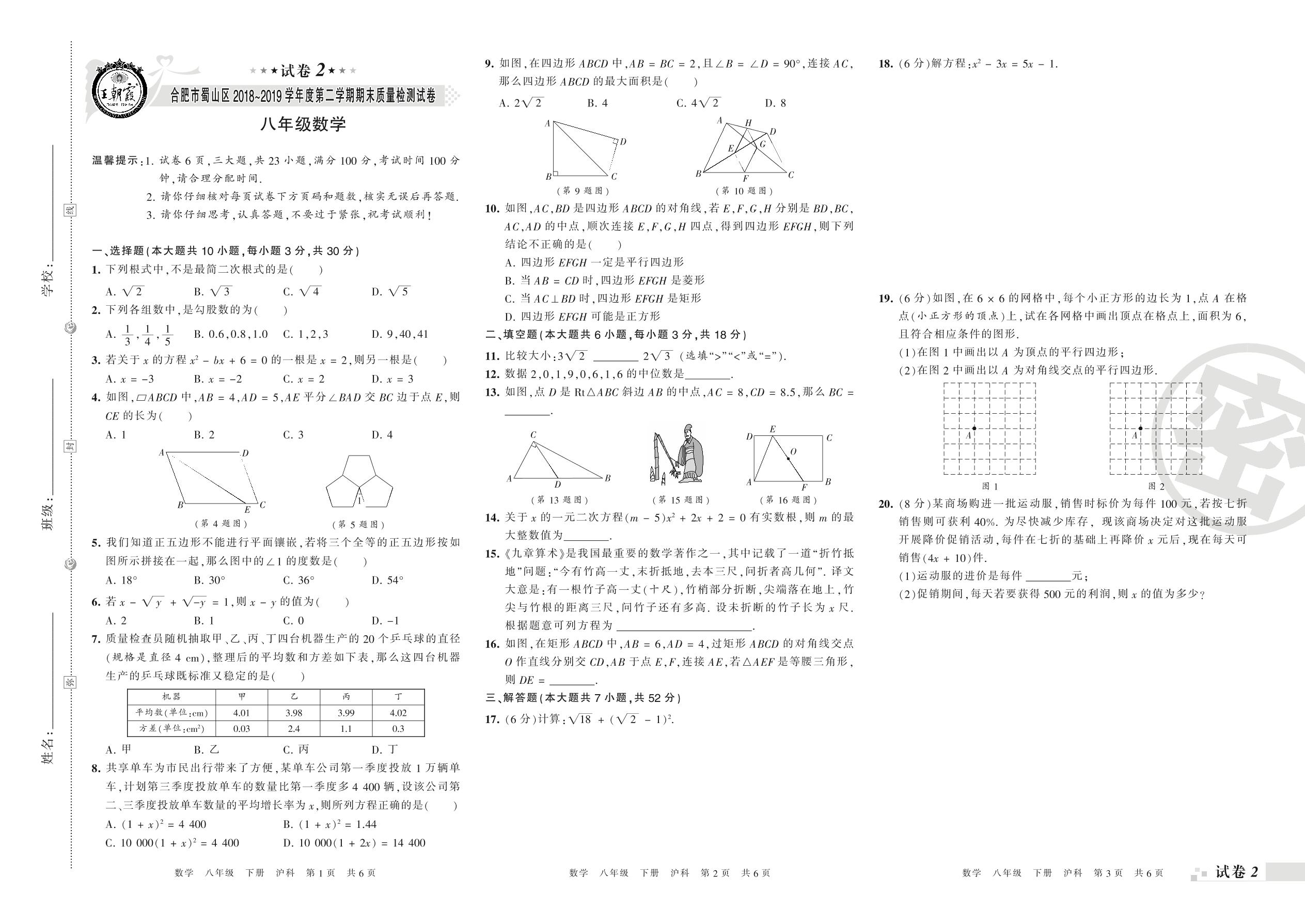 2018-2019学年第二学期合肥市蜀山区八年级数学试卷(沪科版)【2】