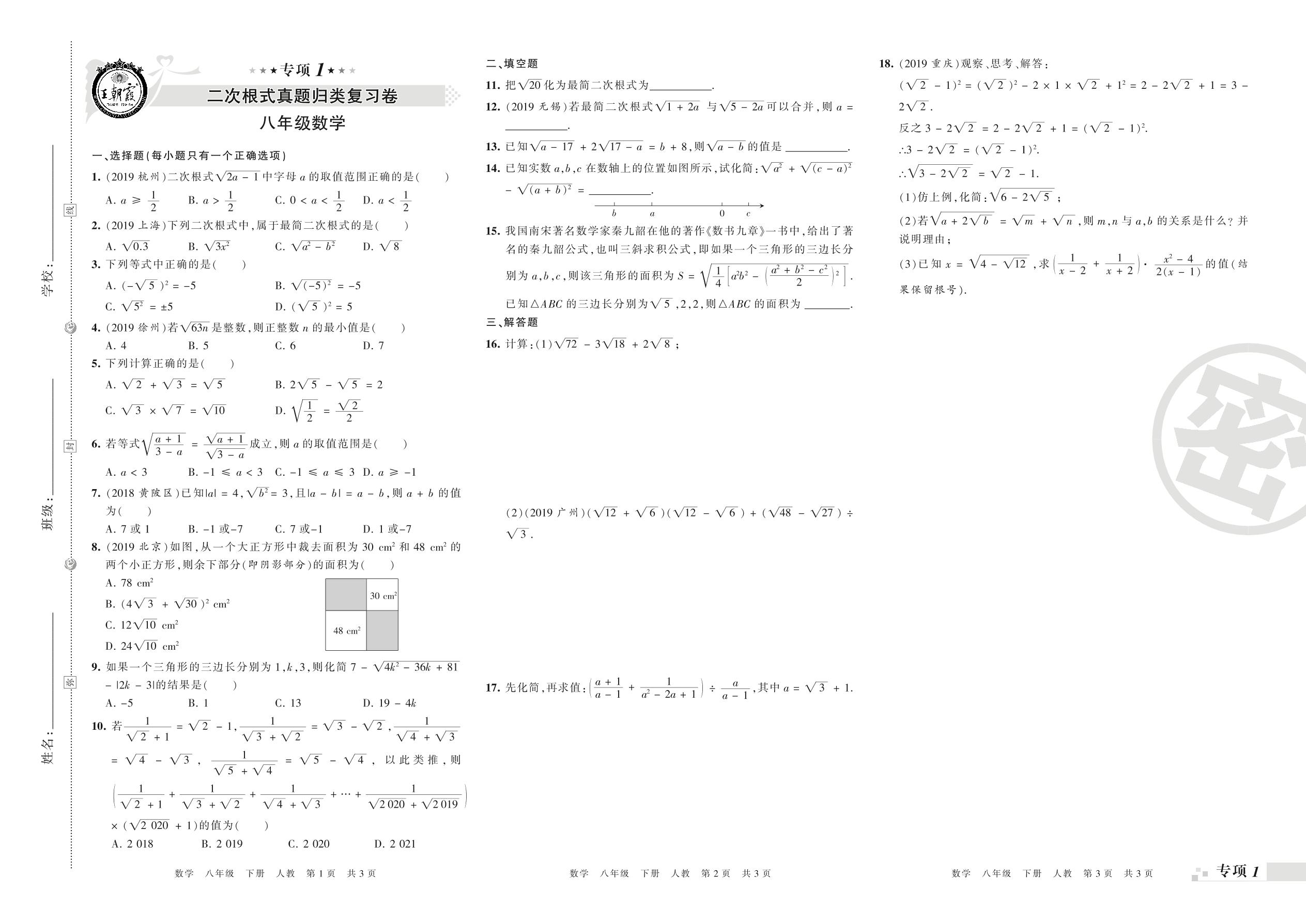 王朝霞期末专项卷——二次根式、勾股定理真题归类复习卷八年级下册数学(人教版)_R21080694940【0】