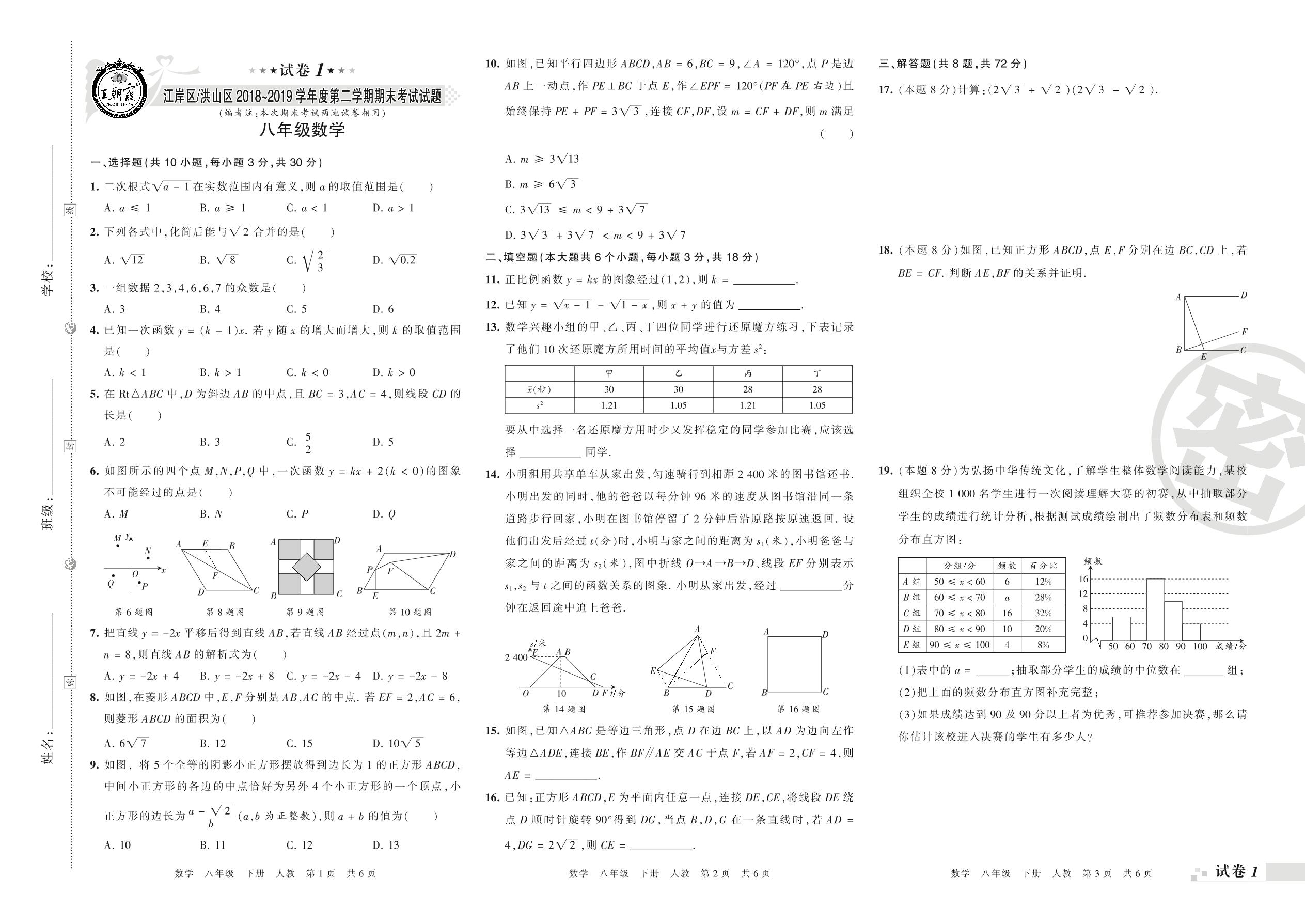 2018-2019学年第二学期武汉市江岸区、洪山区八年级数学试卷(人教版)【1】