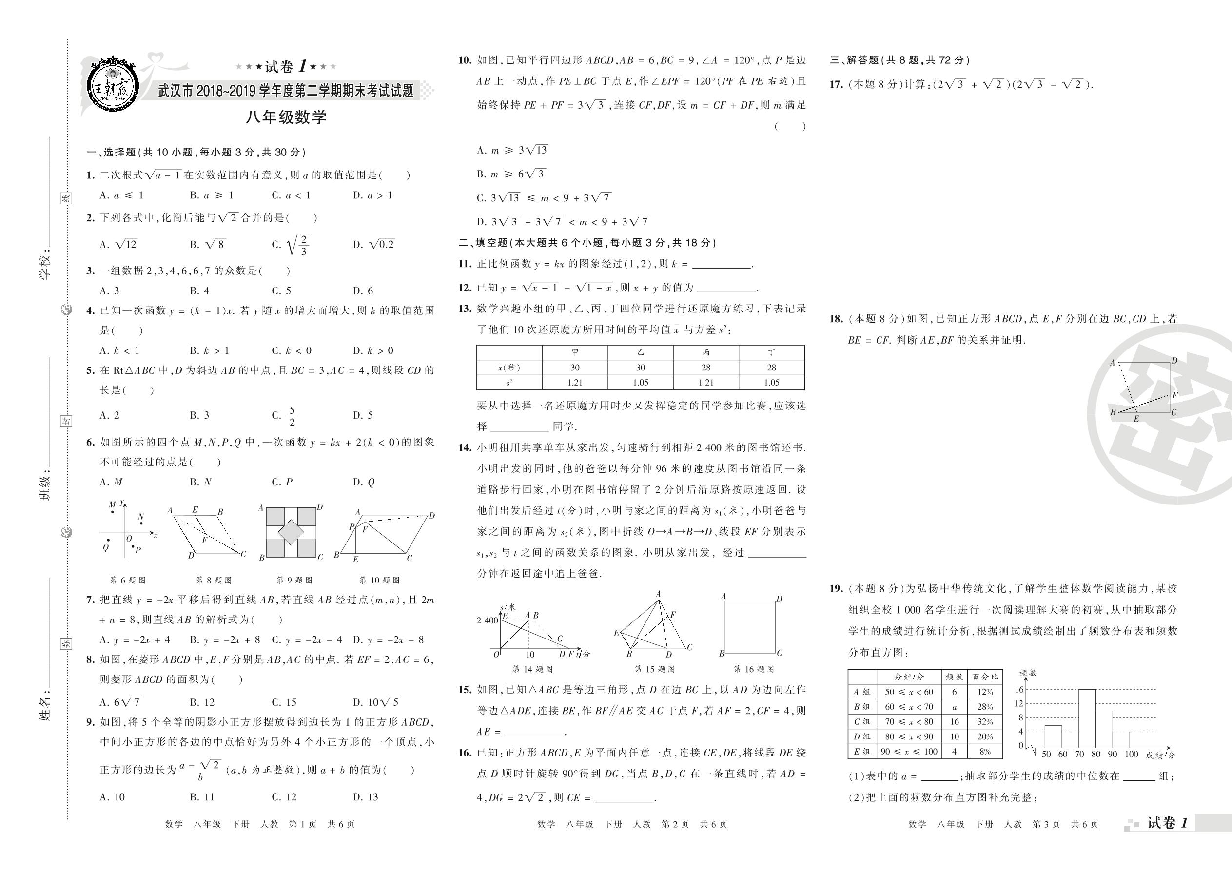 2018-2019学年第二学期武汉市八年级数学试卷(人教版)【1】