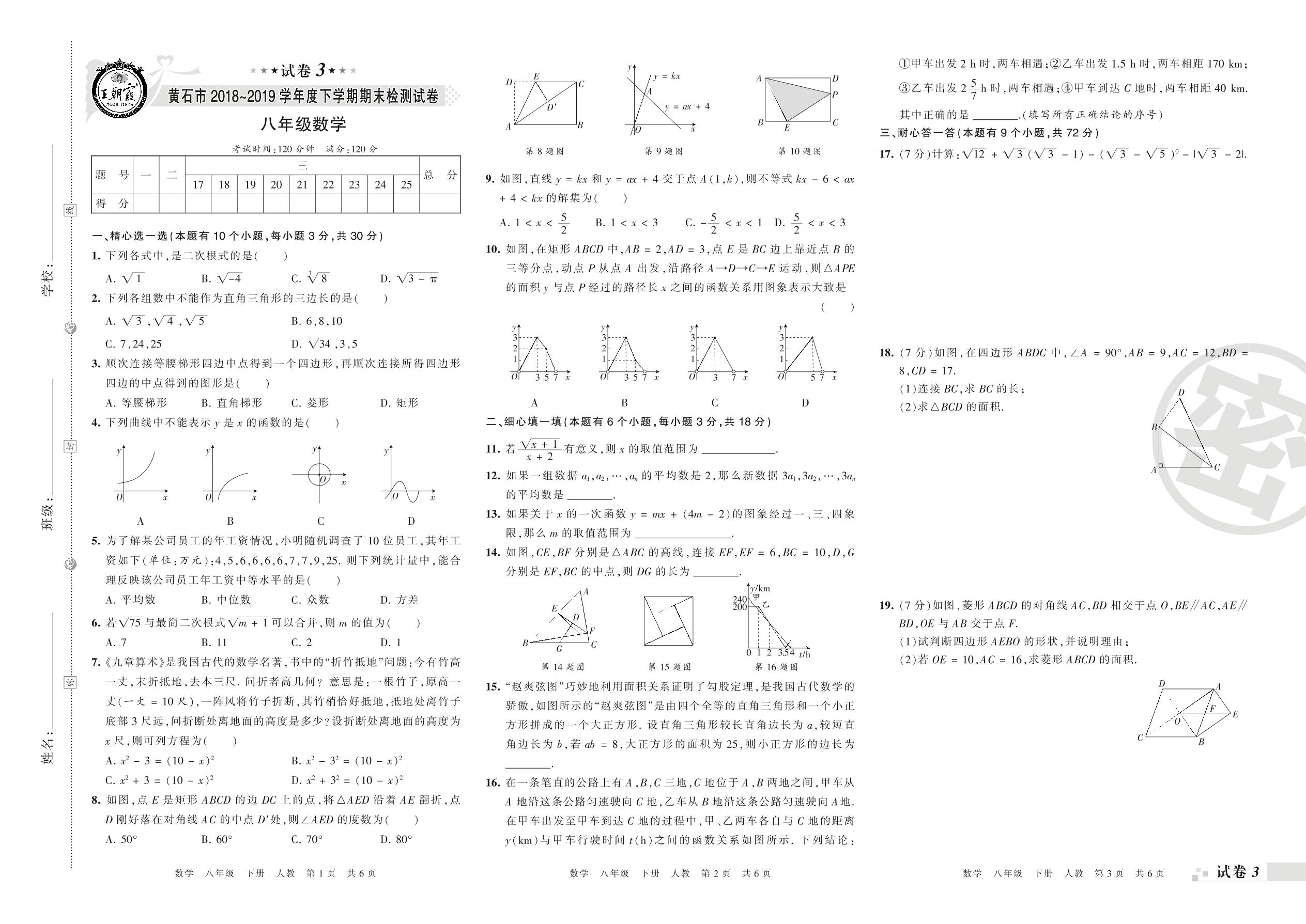 2018-2019学年第二学期黄石市八年级数学试卷(人教版)【3】