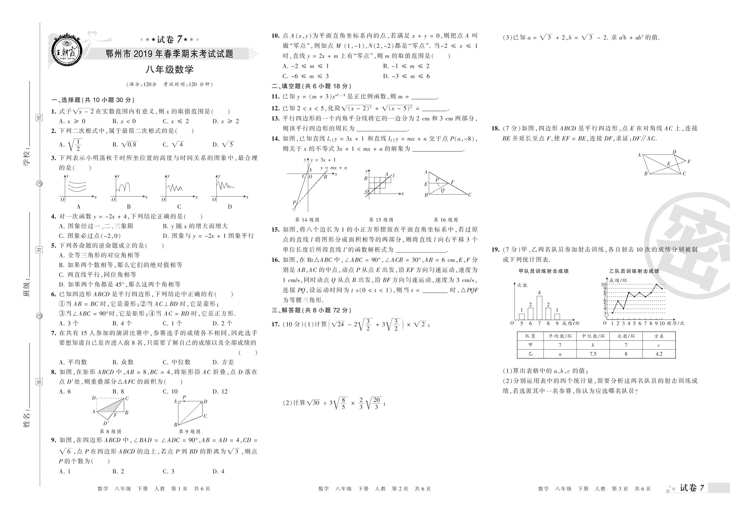 2018-2019学年第二学期鄂州市八年级数学试卷(人教版)【7】