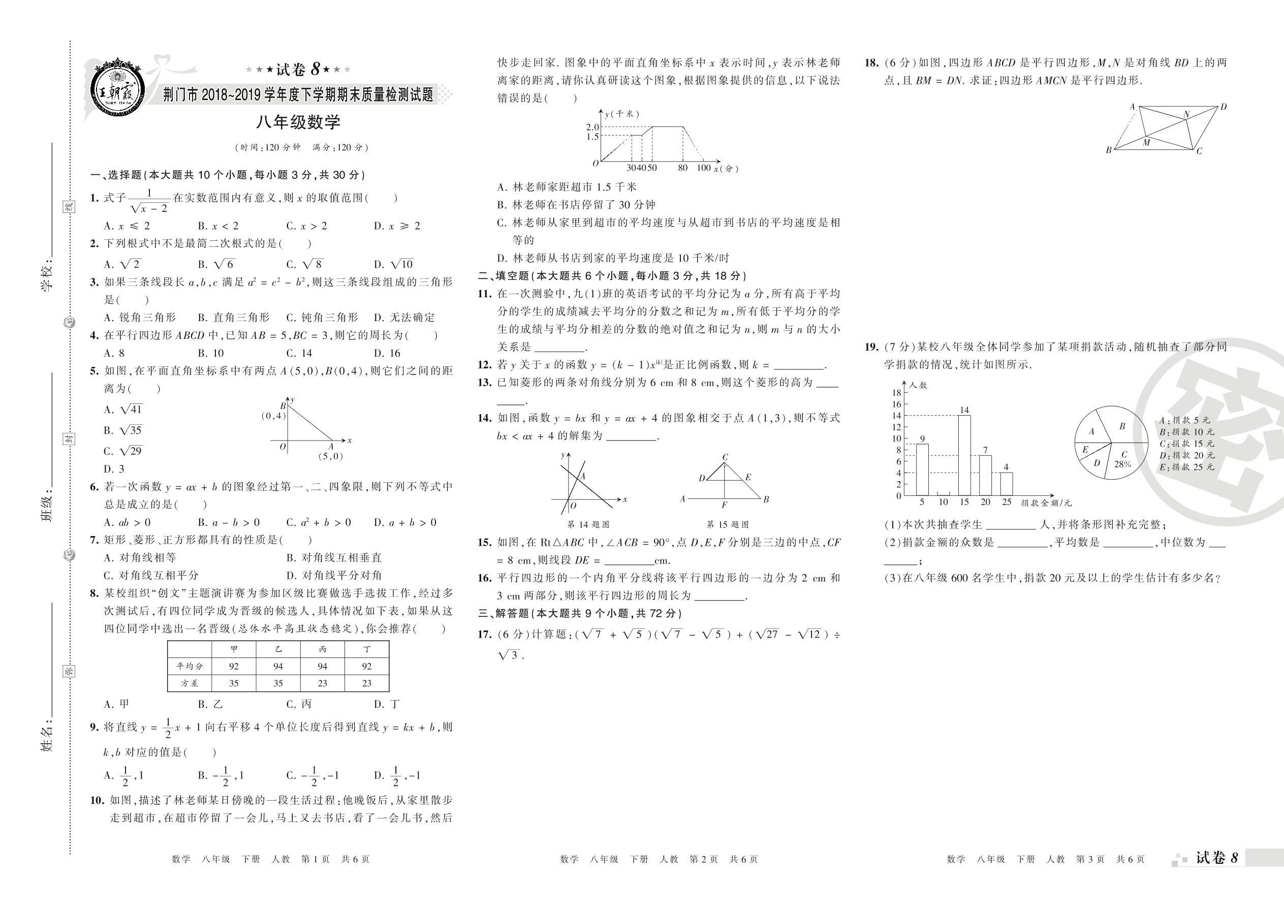 2018-2019学年第二学期荆门市八年级数学试卷(人教版)【8】