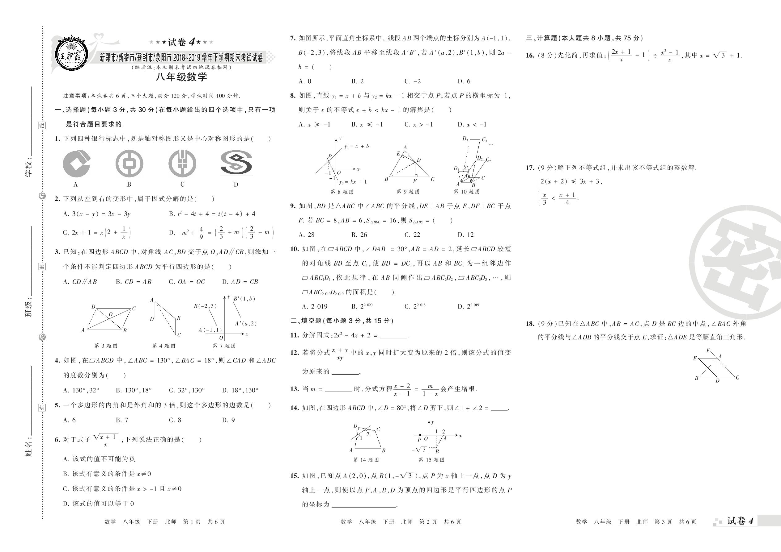 2018-2019学年第二学期新郑市、新密市、登封市、荥阳市八年级数学试卷(北师版)【4】