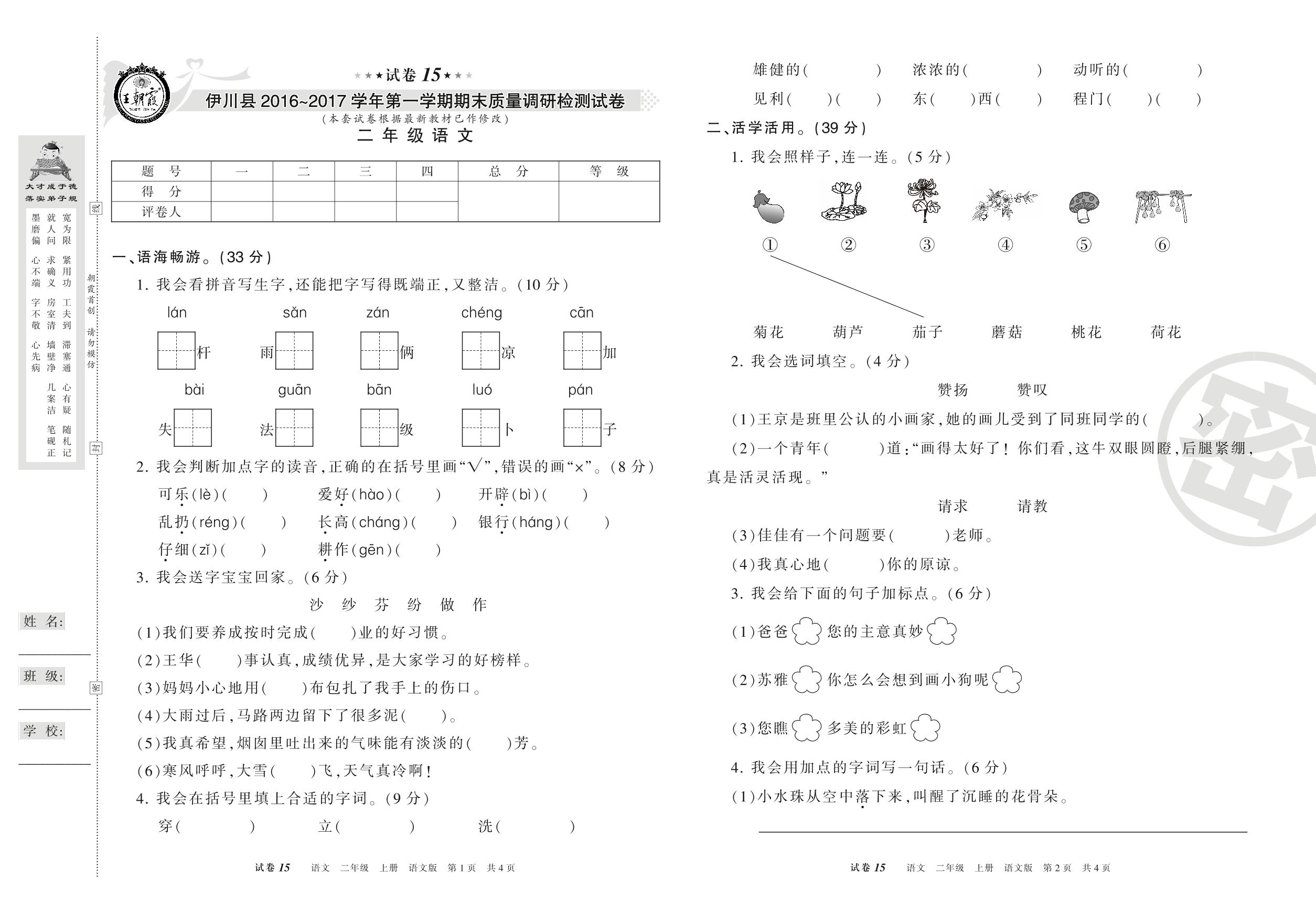 2016-2017学年第一学期洛阳市伊川县二年级语文试卷(语文版)【15】