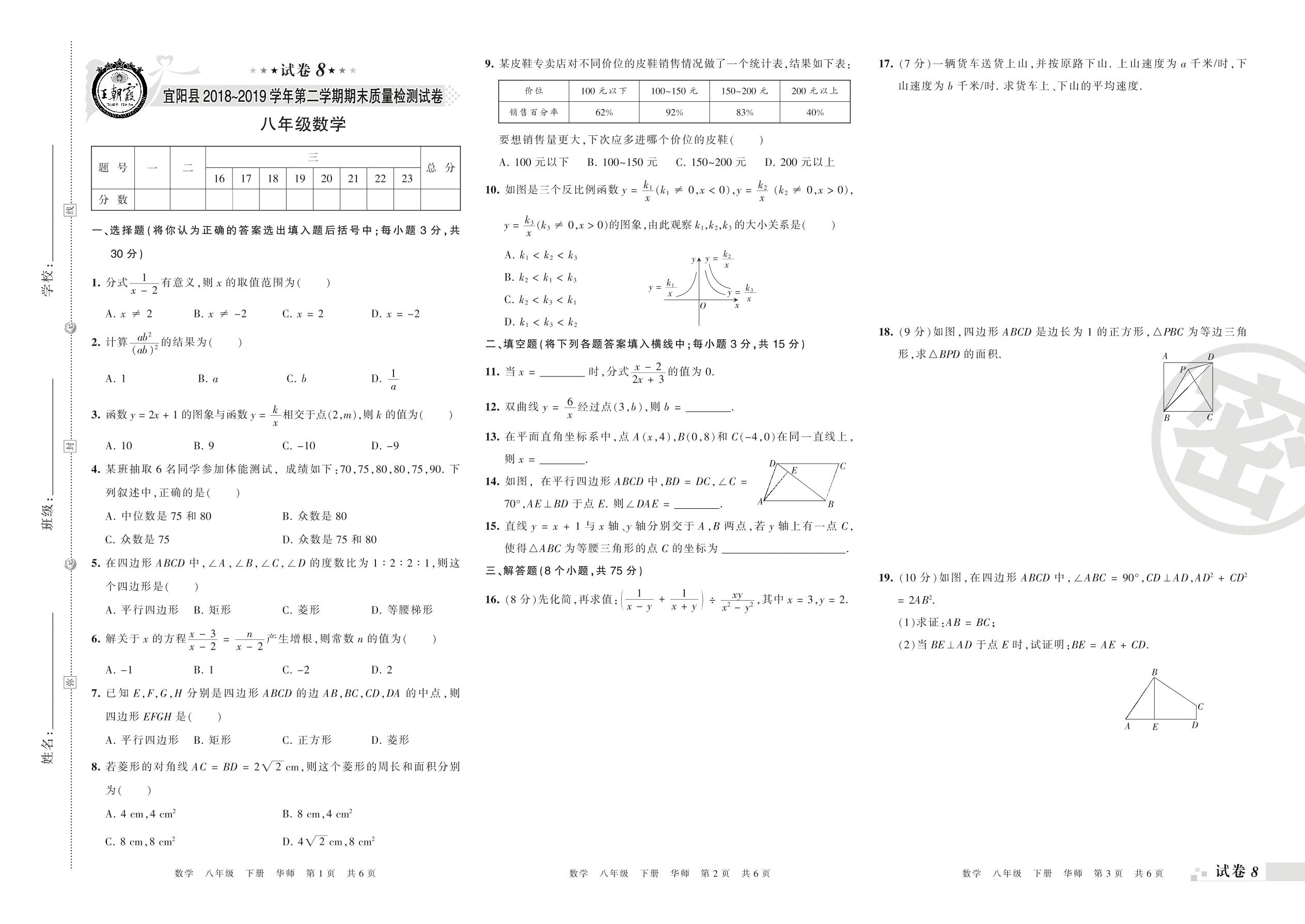 2018-2019学年第二学期洛阳市宜阳县八年级数学试卷(华师版)【8】