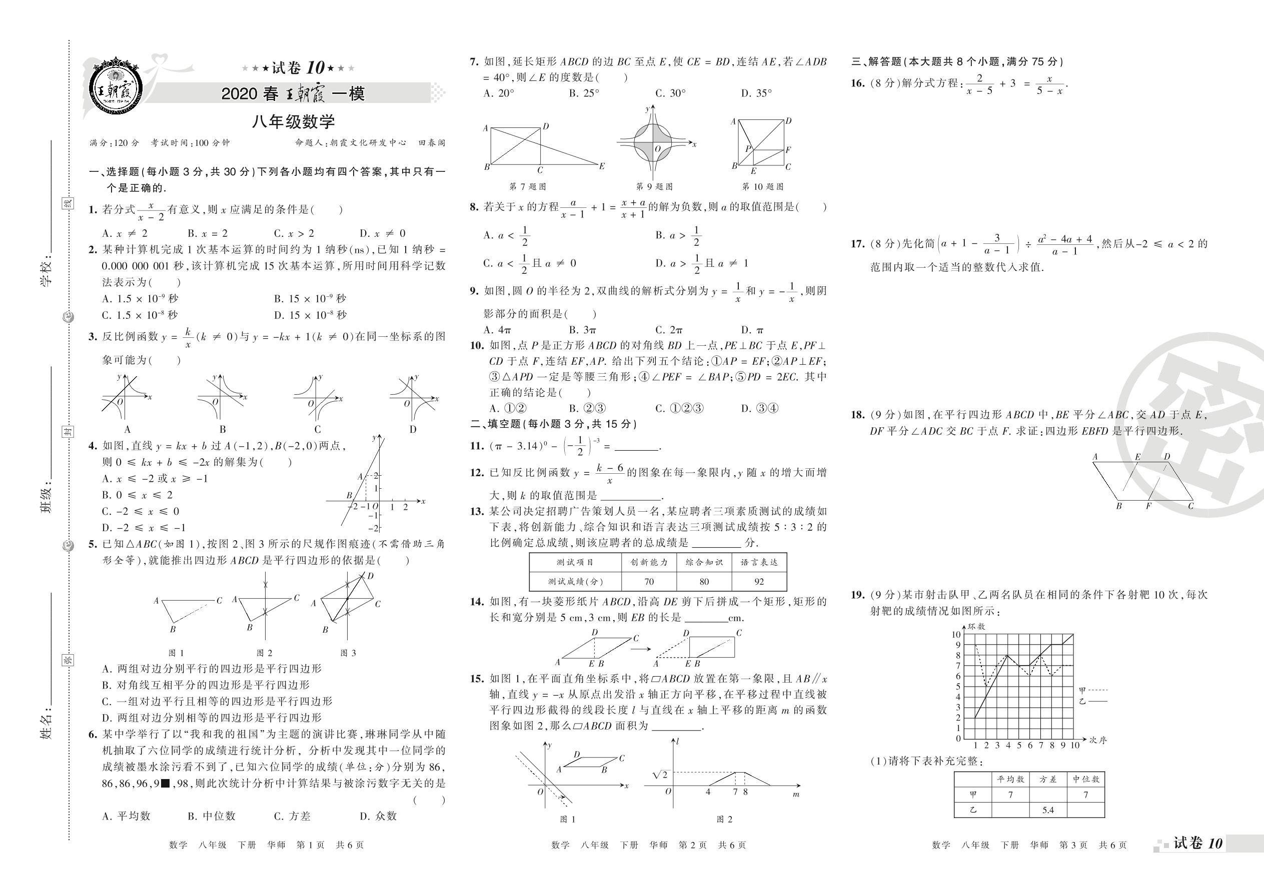 王朝霞期末模拟卷八年级下册数学(华师版)_R210806100154【10】