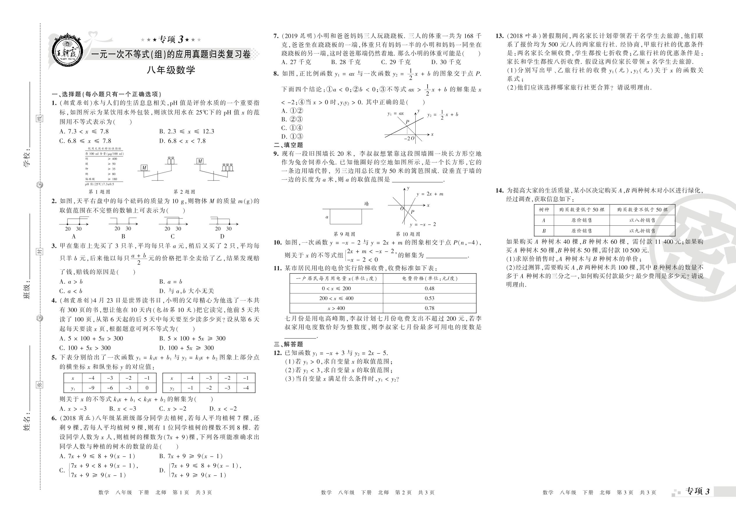 王朝霞期末专项卷——一元一次不等式(组)的应用、图形的平移与旋转真题归类复习卷八年级下册数学(北师版)_R210806100233【0】