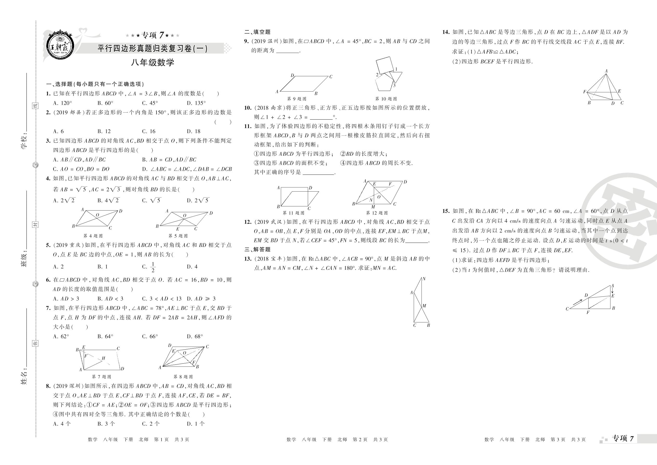 王朝霞期末专项卷——平行四边形(一)(二)真题归类复习卷八年级下册数学(北师版)_R210806100243【0】