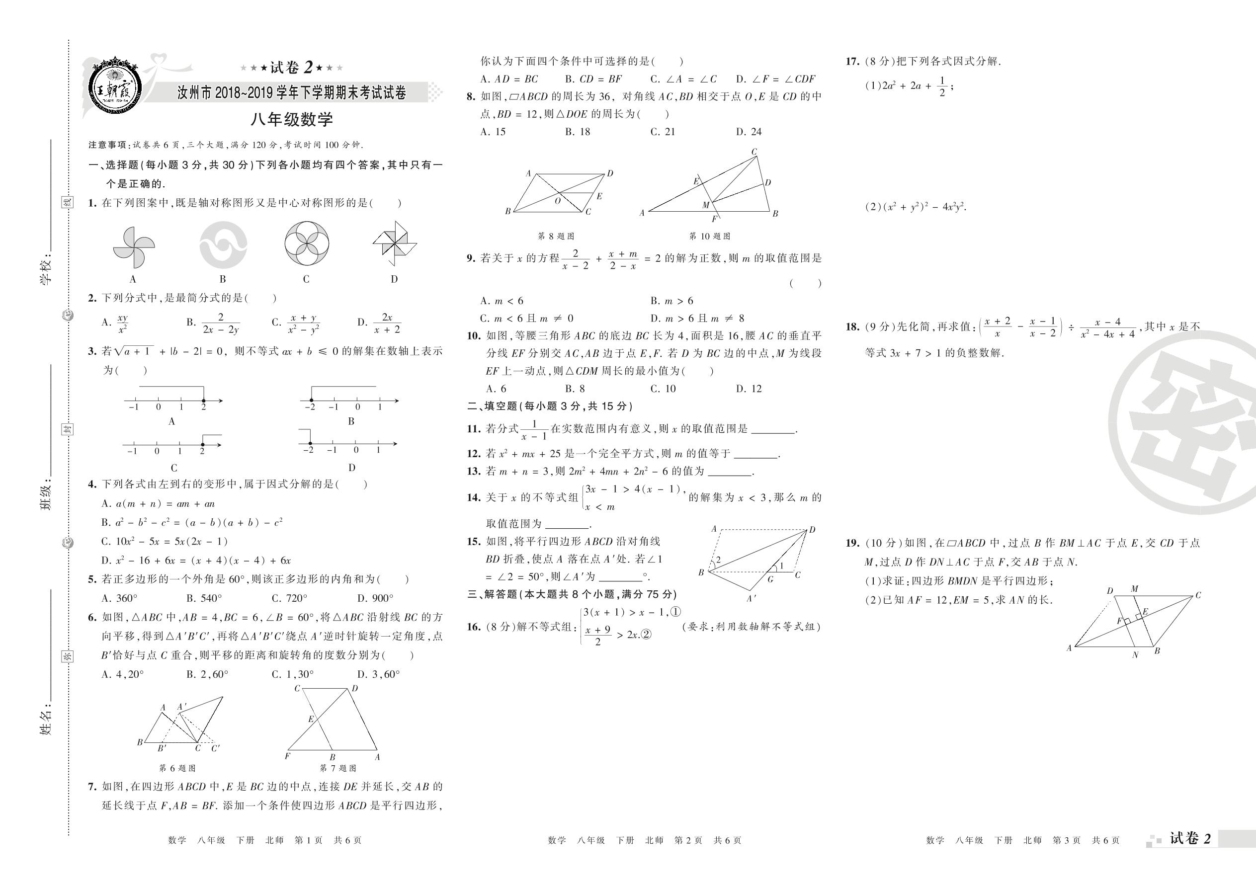 2018-2019学年第二学期汝州市八年级数学试卷(北师版)【2】
