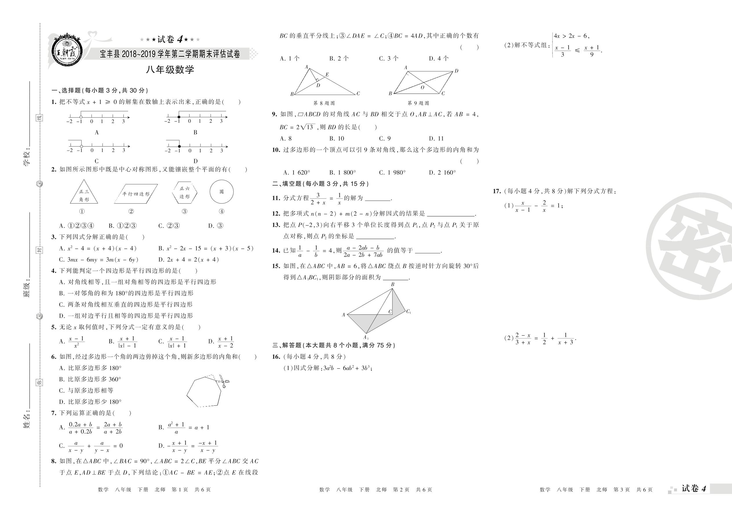 2018-2019学年第二学期平顶山市宝丰县八年级数学试卷(北师版)【4】