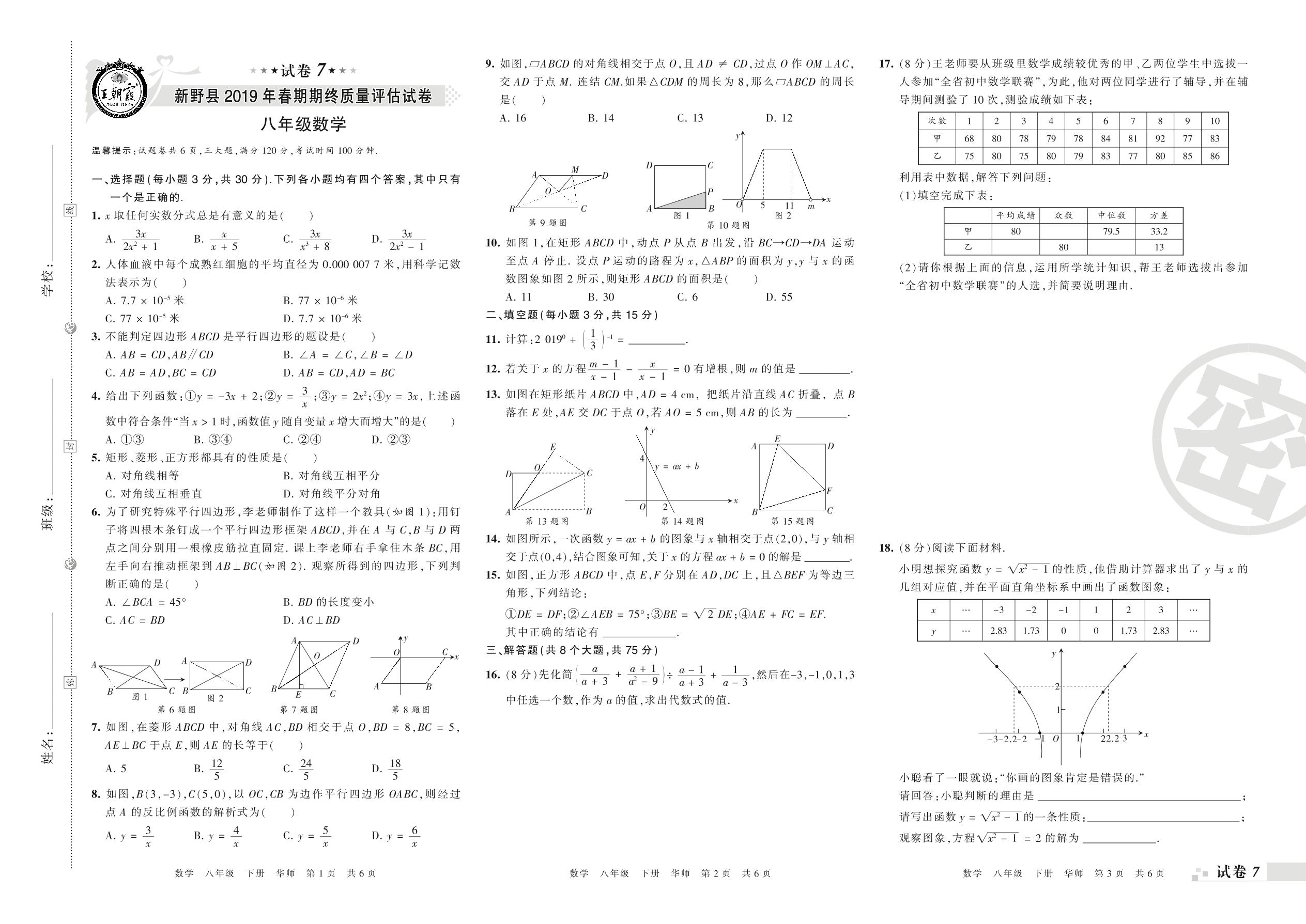 2018-2019学年第二学期南阳市新野县八年级数学试卷(华师版)【7】
