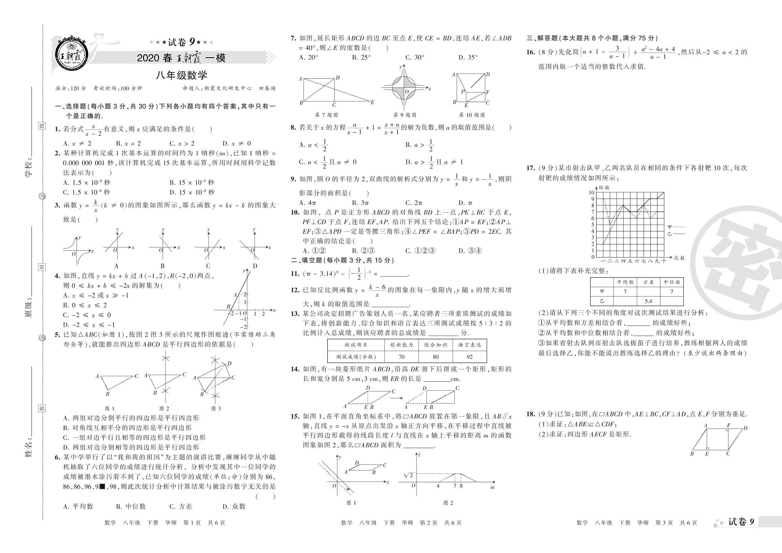 王朝霞期末模拟卷八年级下册数学(华师版)_R210806100829【9】
