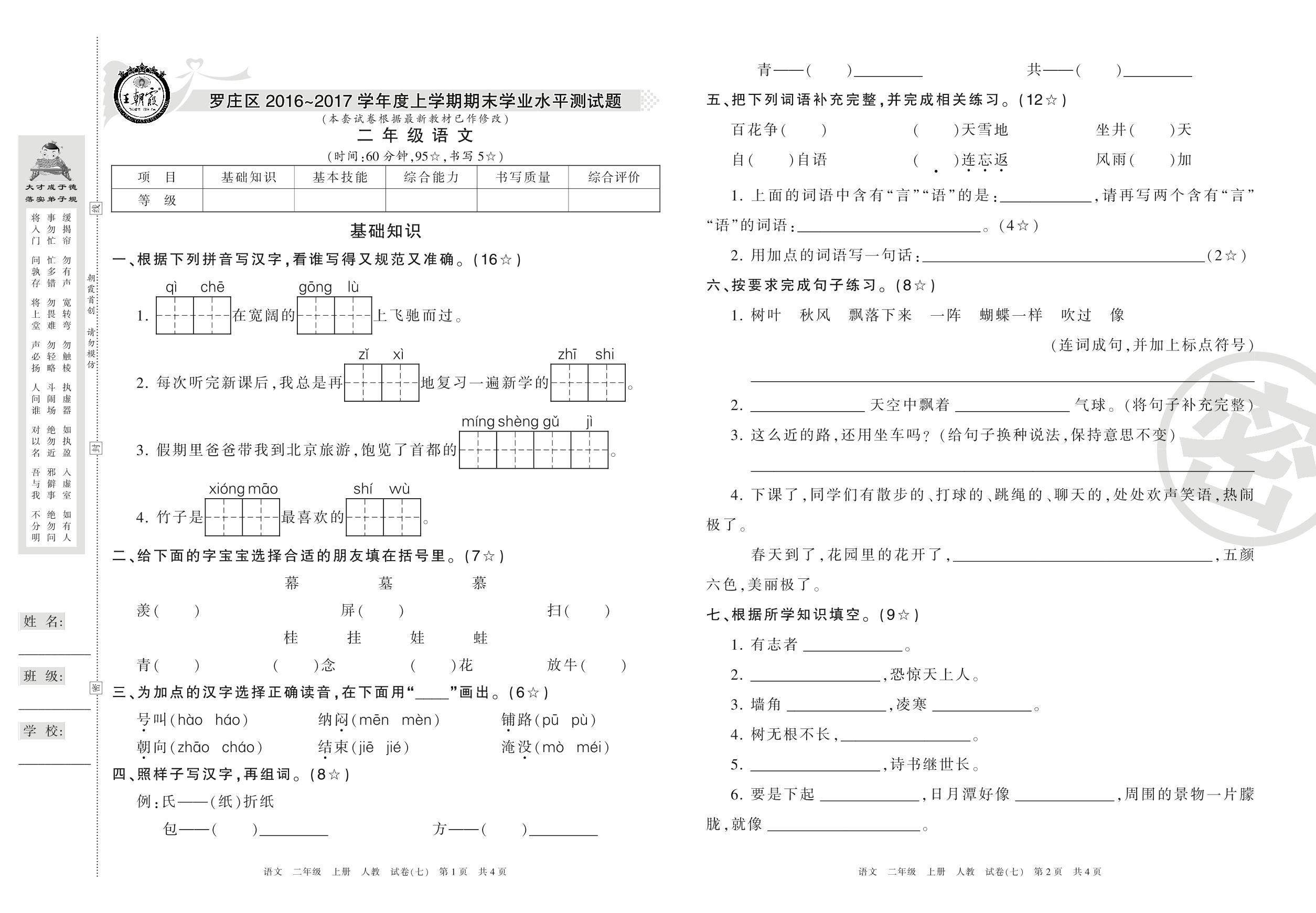 2016-2017学年第一学期临沂市罗庄区二年级语文试卷(人教版)【7】