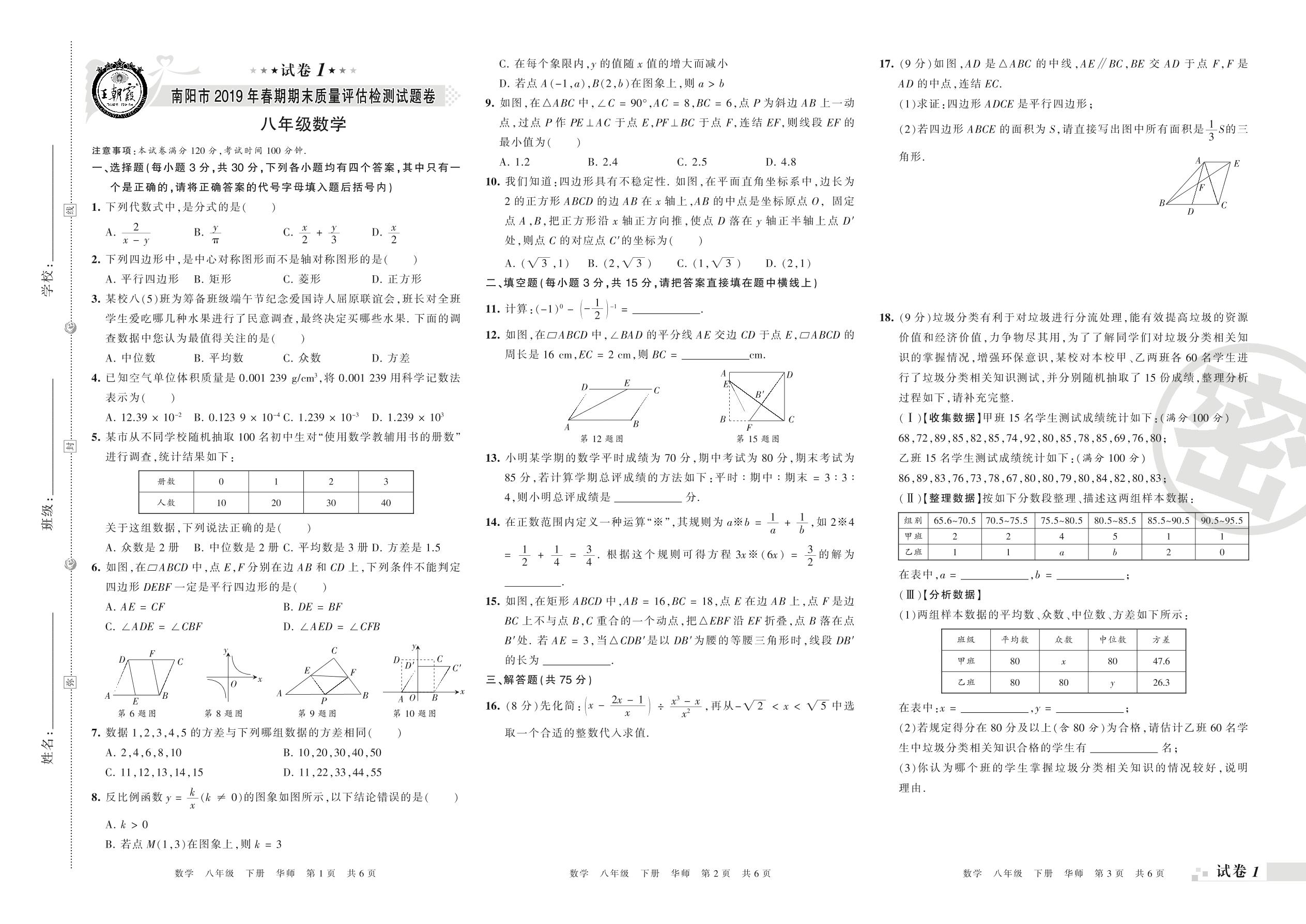 2018-2019学年第二学期南阳市八年级数学试卷(华师版)_R210806101051【1】