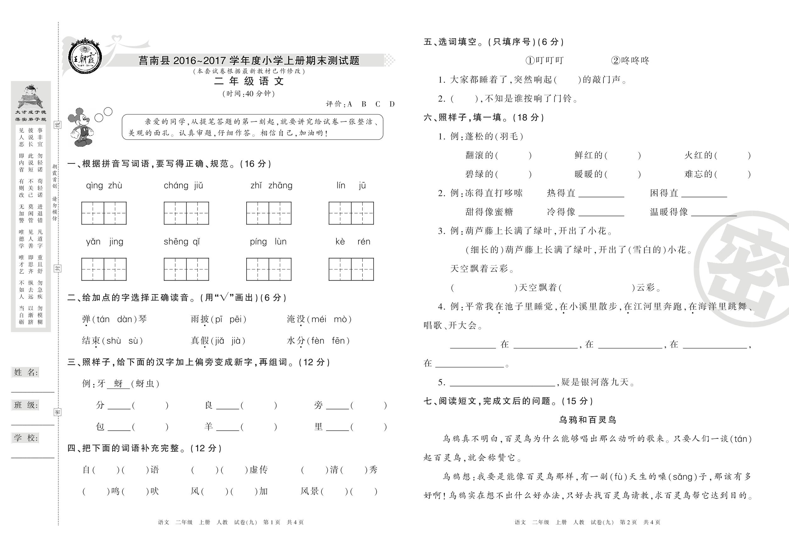 2016-2017学年第一学期临沂市莒南县二年级语文试卷(人教版)【9】