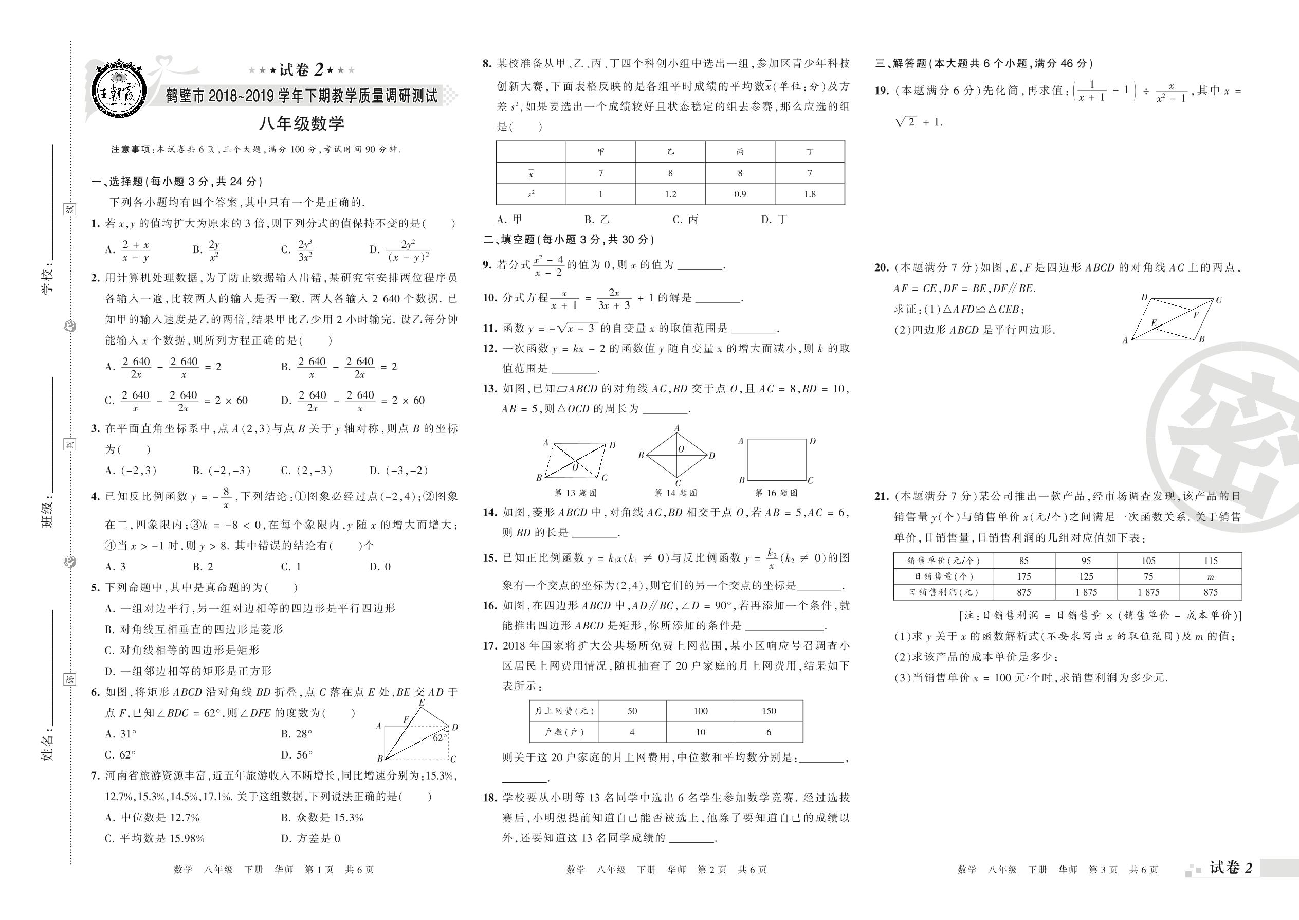 2018-2019学年第二学期鹤壁市八年级数学试卷(华师版)【2】