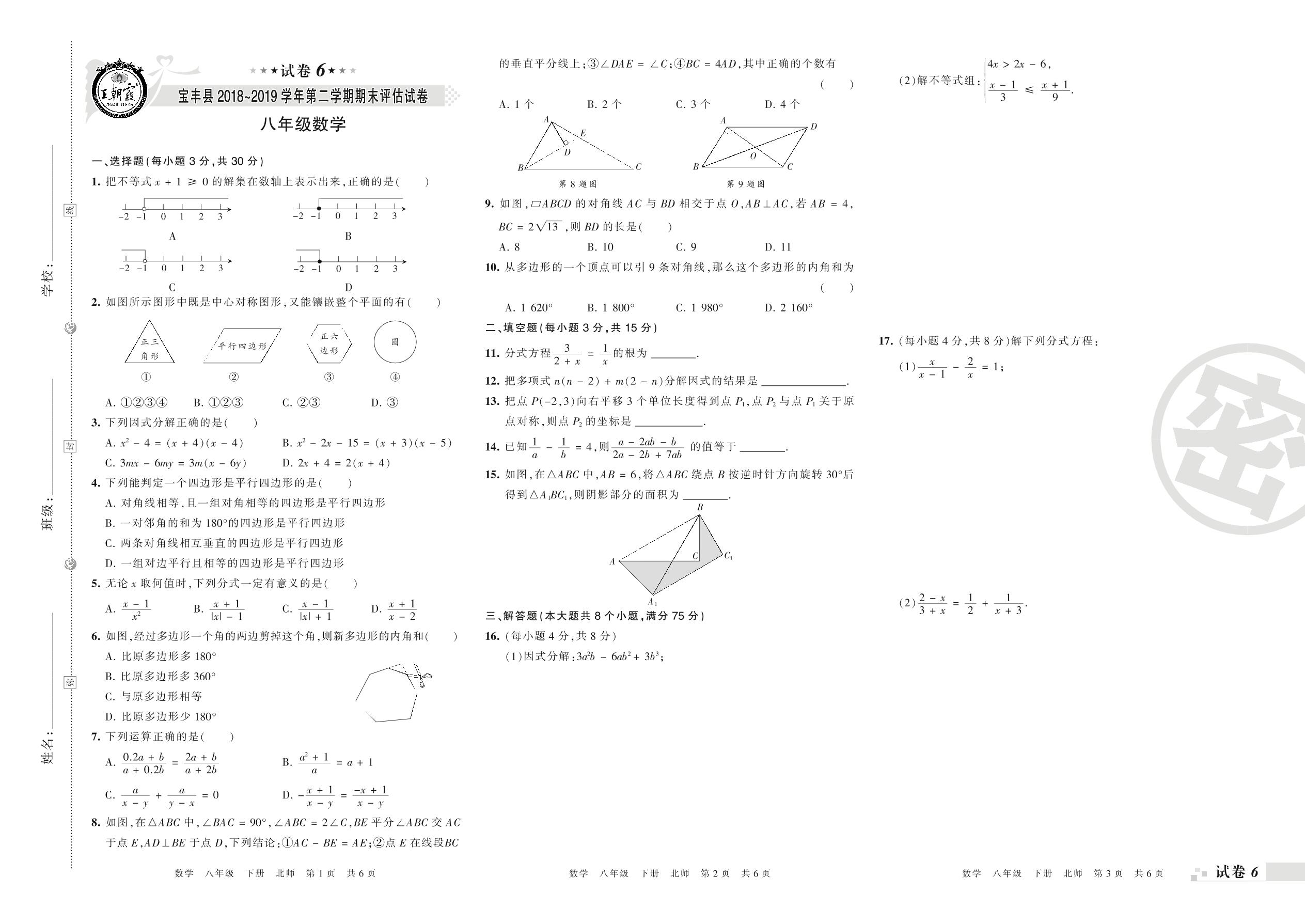 2018-2019学年第二学期平顶山市宝丰县八年级数学试卷(北师版)【6】