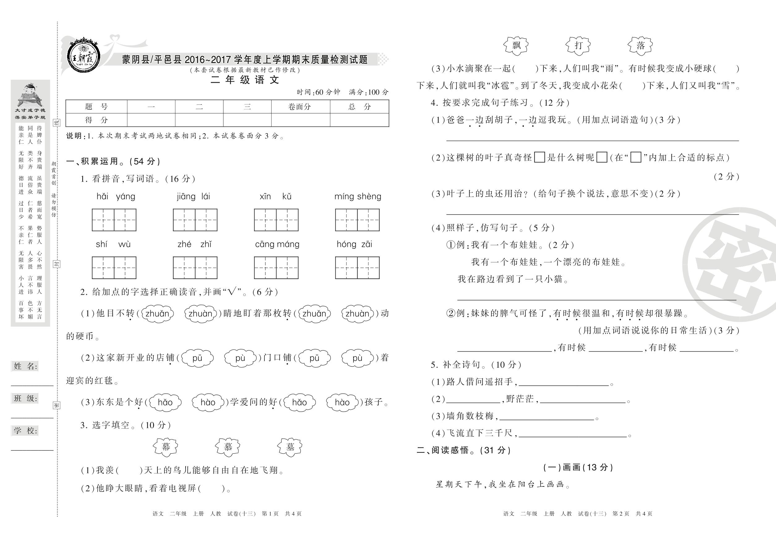 2016-2017学年第一学期临沂市蒙阴县(平邑县)二年级语文试卷(人教版)【13】