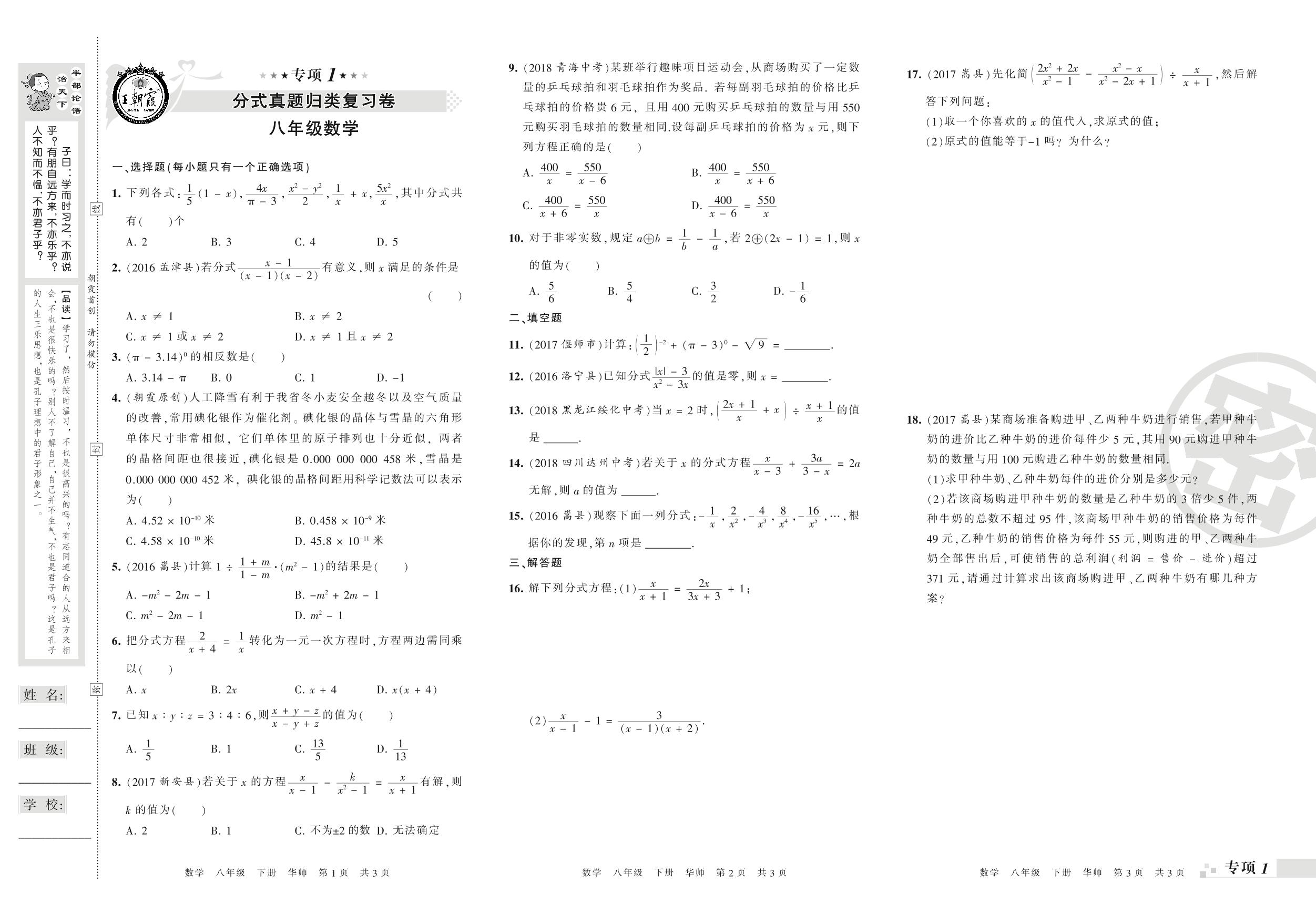 王朝霞期末专项卷——分式 变量与函数、函数的图象真题归类复习卷八年级下册数学(华师版)_R210806101708【0】