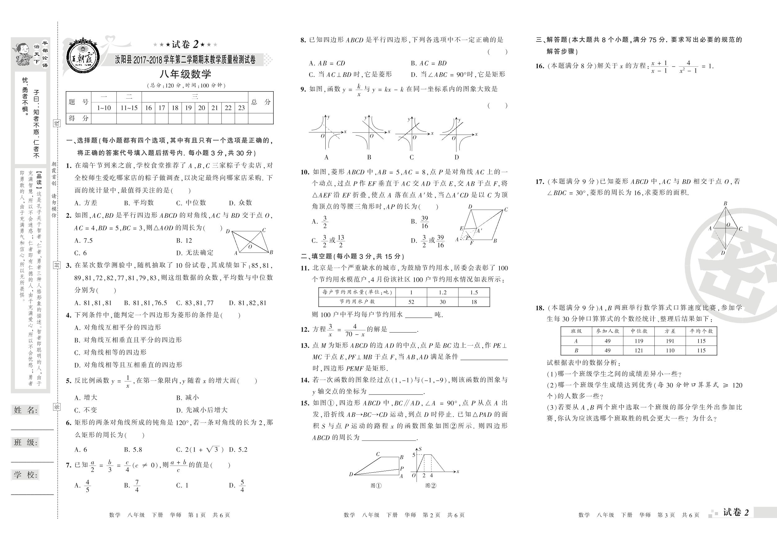 2017-2018学年第二学期汝阳县八年级数学试卷(华师版)【2】