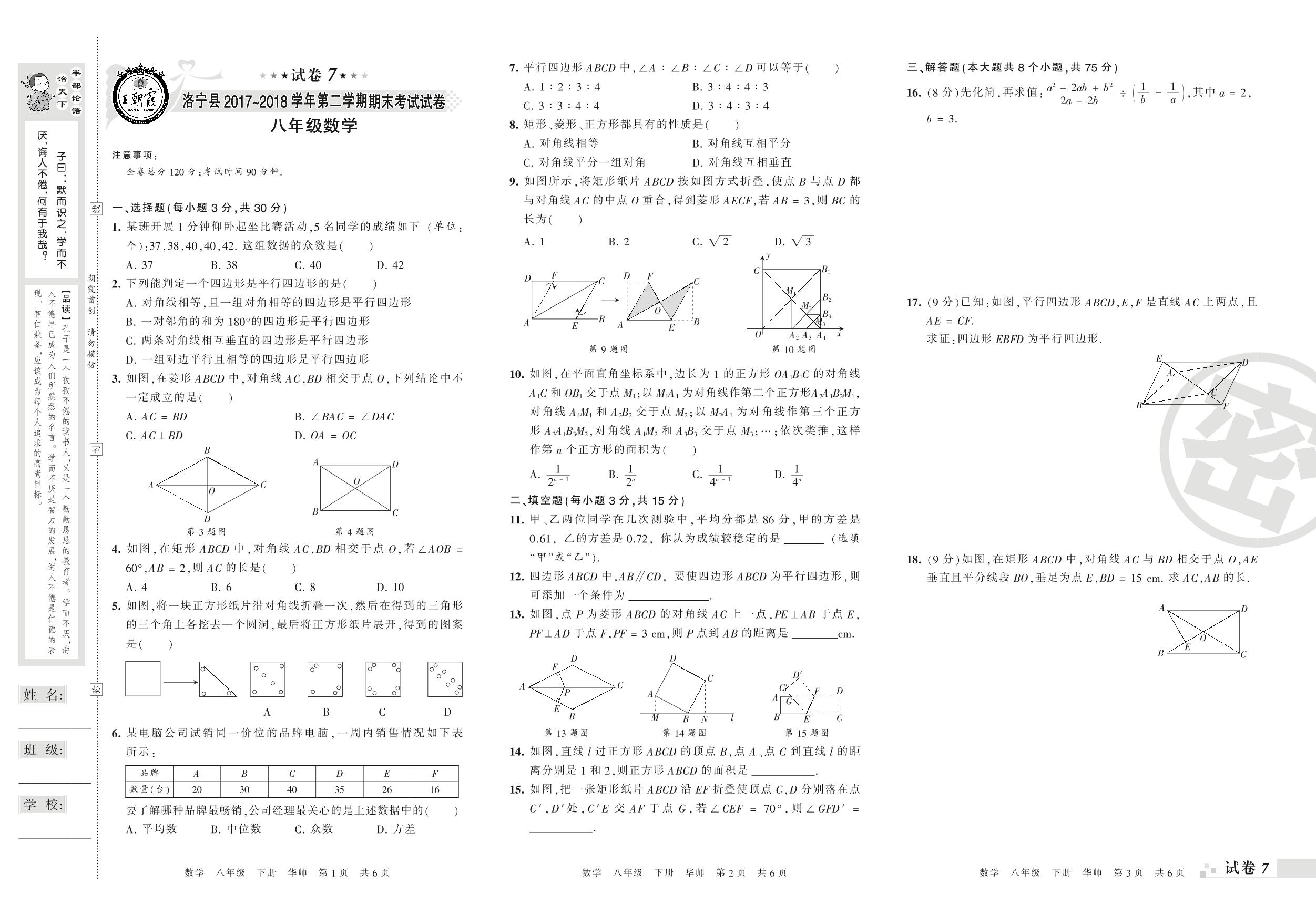 2017-2018学年第二学期洛阳市洛宁县八年级数学试卷(华师版)【7】