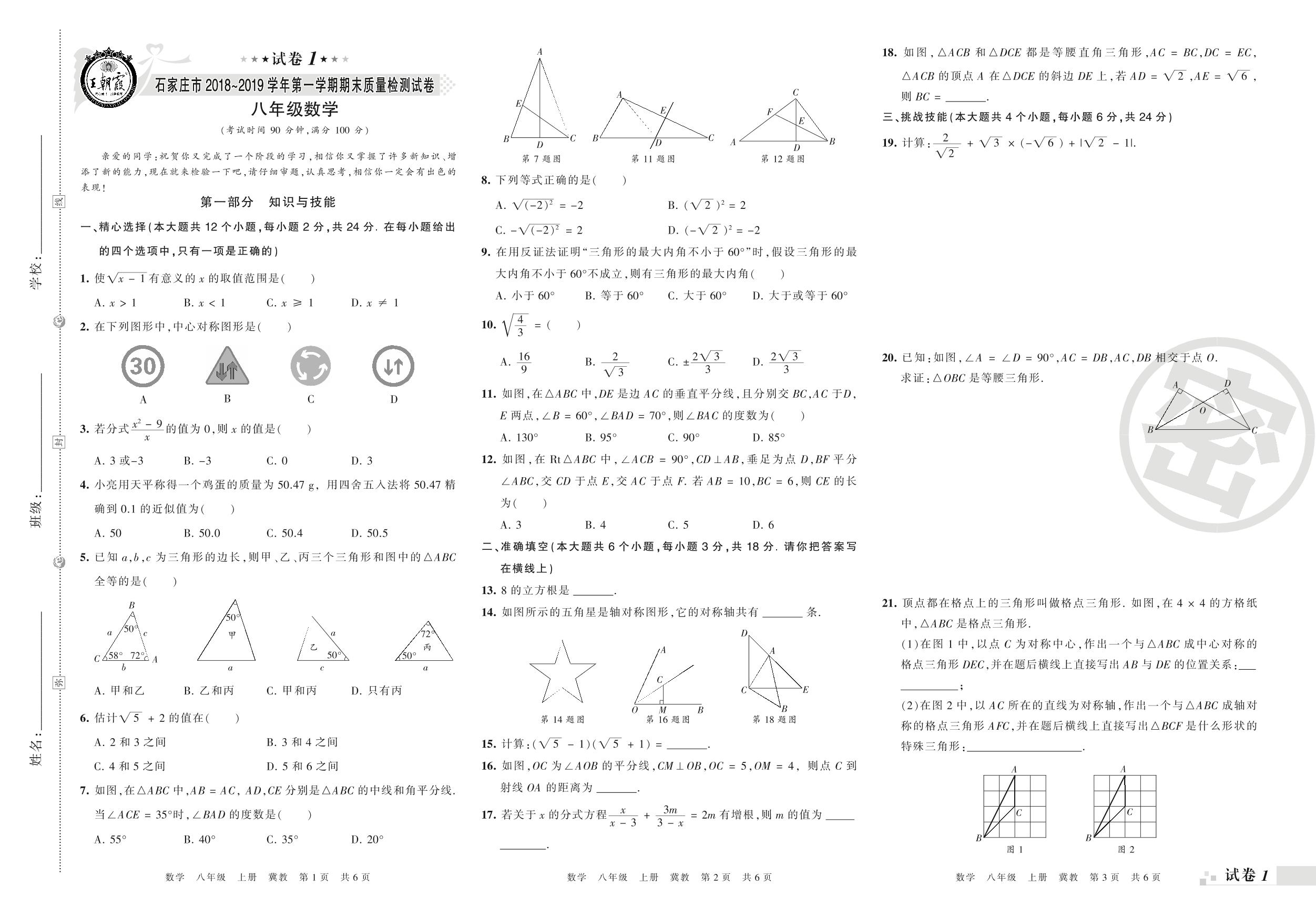 2018-2019学年第一学期石家庄市八年级数学试卷(冀教版)【1】