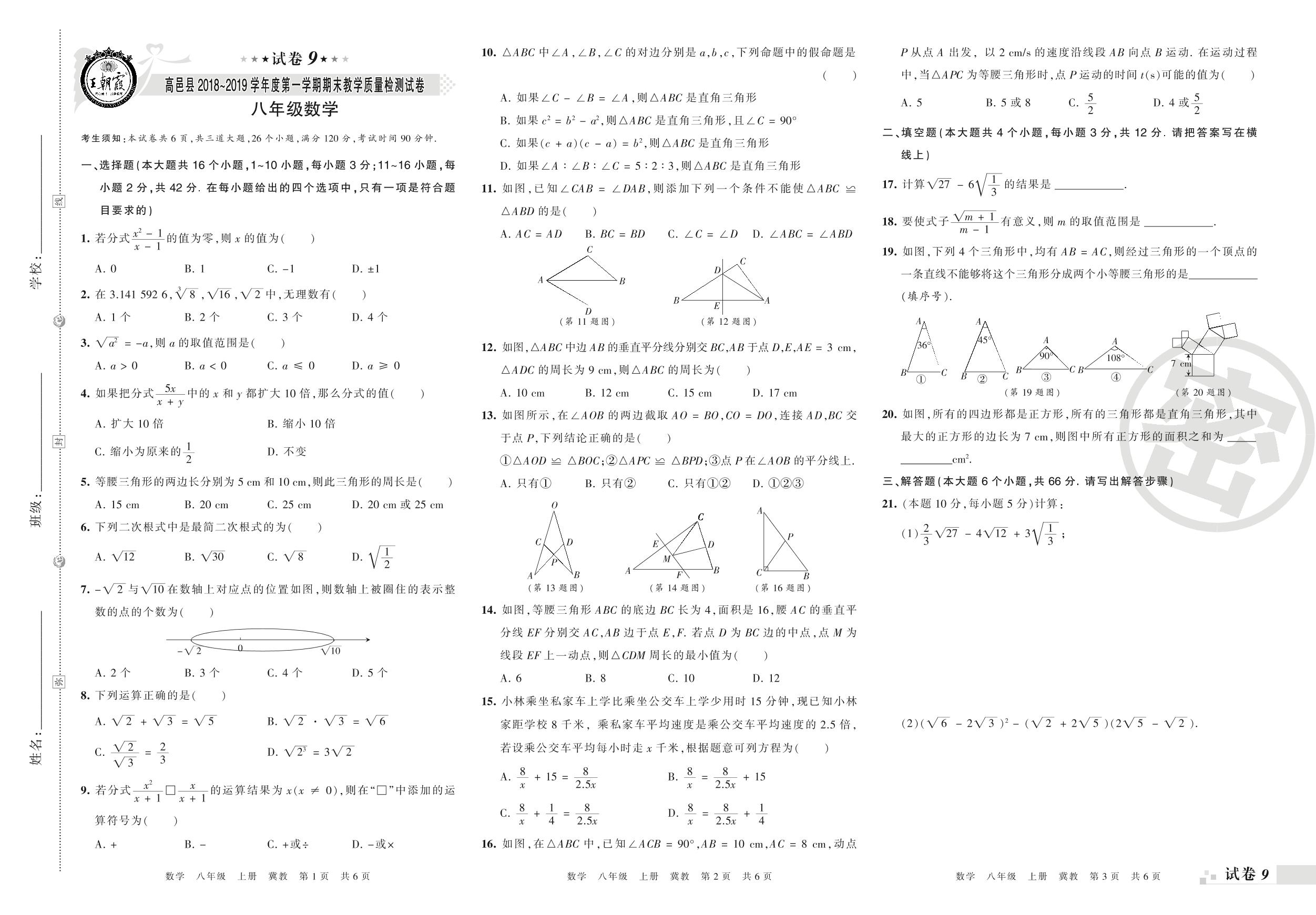 2018-2019学年第一学期石家庄市高邑县八年级数学试卷(冀教版)【9】