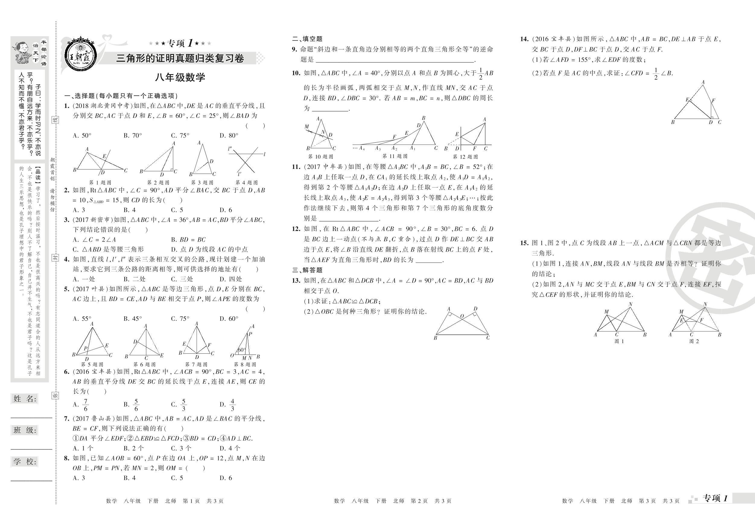 王朝霞期末专项卷——三角形的证明、一元一次不等式与一元一次不等式组的认识与解法真题归类复习卷八年级下册数学(北师版)_R210806101954【0】