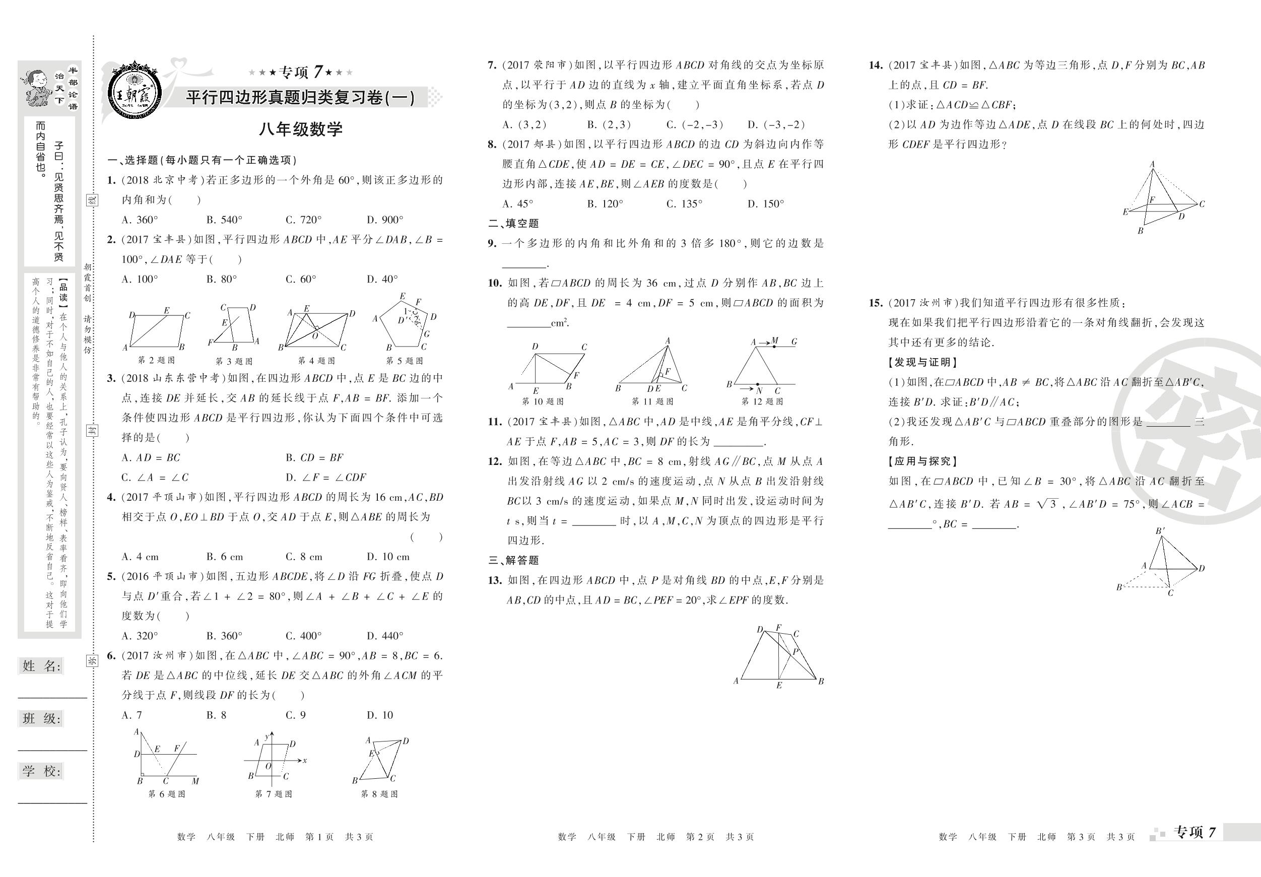 王朝霞期末专项卷——平行四边形(一)(二)真题归类复习卷八年级下册数学(北师版)_R210806102012【0】